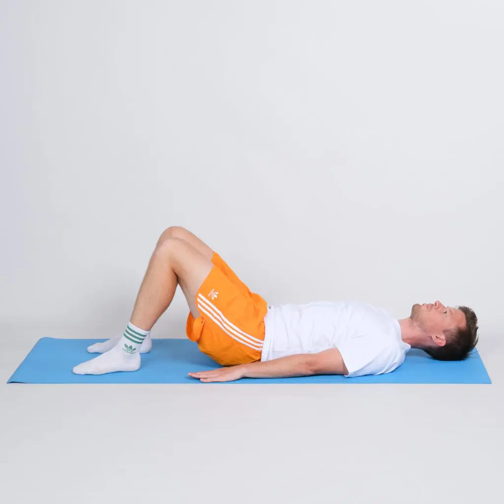 Lig på ryggen og bøj 90 grader i hofter og knæ, så underbenene er løftet og parallel med gulvet. Nakken er i gulvet. Armene strakt ud til siderne. Før langsomt knæene skiftevis til venstre og højre siden ved at dreje i lænden og hofterne. Knæene er bøjede 90 grader og fødderne samlet under hele øvelsen.