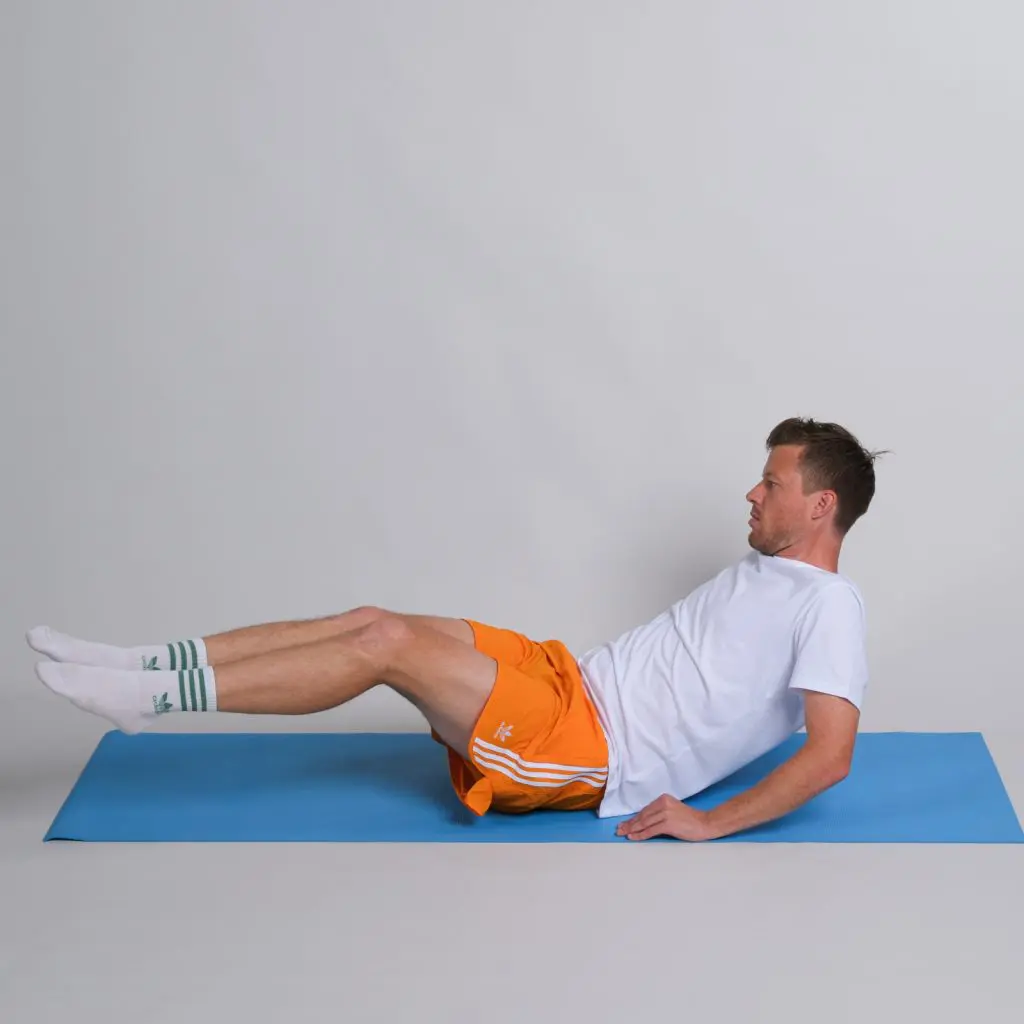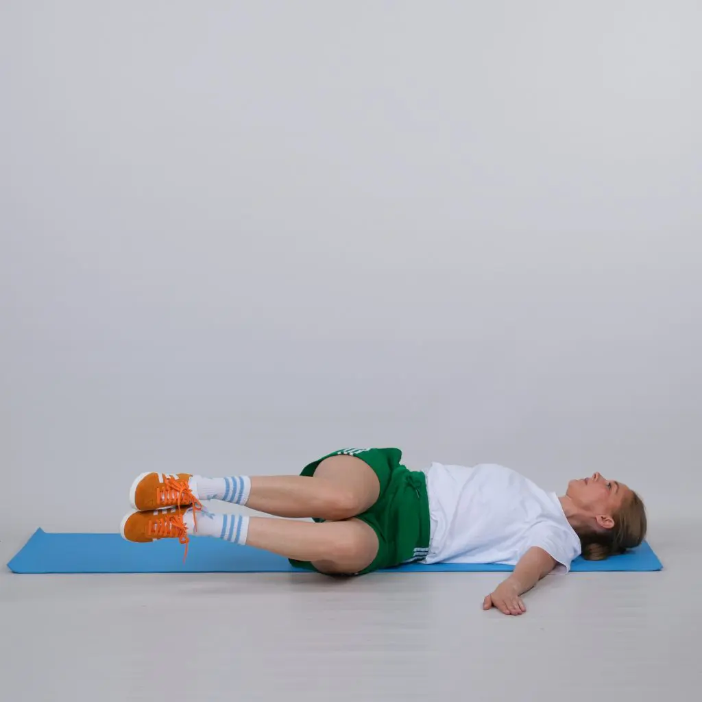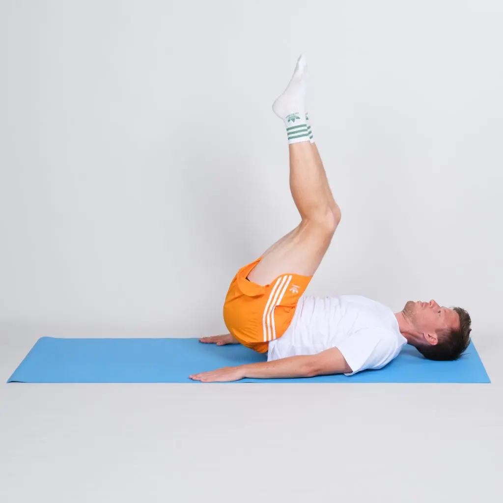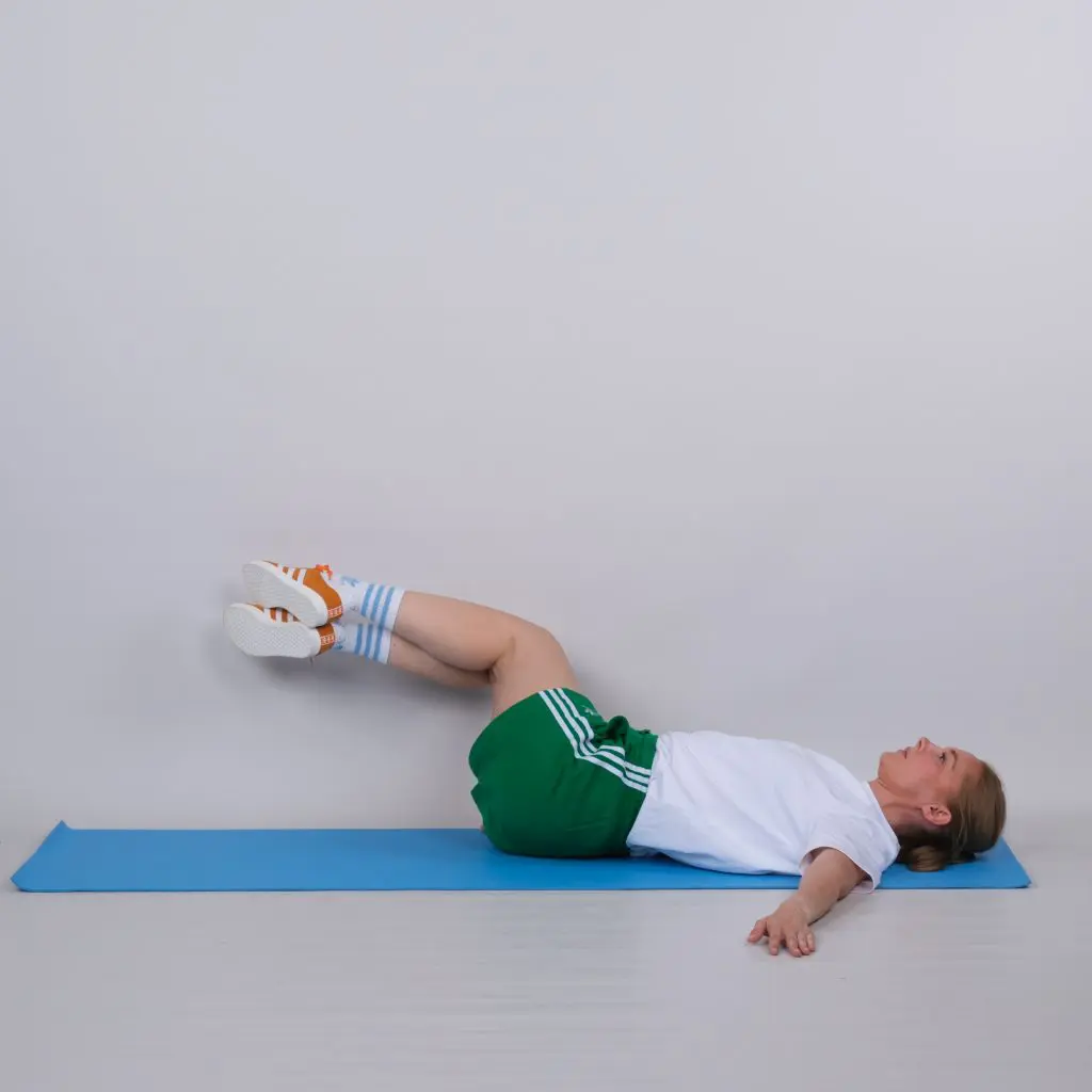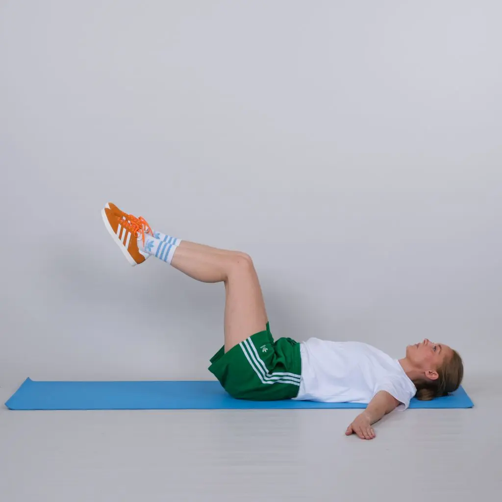”Reverse crunches”. Lig på gulvet med 90 grader bøjede knæ og hænderne under hoften. Løft fødderne 10 cm op fra gulvet. Med en hurtig bevægelse fører du dine ben ind mod dit bryst, løfter bækkenet fra gulvet og skubber fødderne op mod loftet. I samme bevægelse sænkes bækken og ben, så fødder netop kommer i gulvet inden øvelsen gentages.