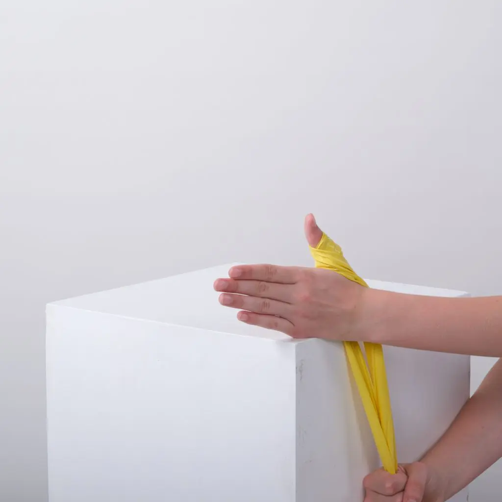 Sid med hånden ud over kanten af et bord. Håndkanten hviler på bordpladen. Sæt elastikken om tommelfingeren og før elastikken om på håndfladen og ned mod gulvet. Hold fat i elastikken med den raske arm. Rotér underarmen langsomt så meget som muligt, så elastikken strammes og håndfladen vender opad. Hold spændingen i et par sekunder og før hånden langsomt tilbage til udgangsposition-