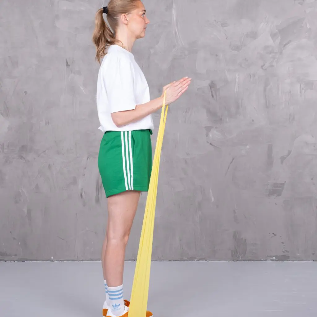 ”Biceps curl”. Stå oprejst med en elastik om foden. Tag den anden ende af elastikken om hånden med håndfladen opad. Bøj langsomt armen, så hånden kommer op mod skulderen, og elastikken spændes. Hold spændingen i få sekunder og stræk langsomt armen tilbage til udgangspositionen. Håndfladen skal under hele øvelsen vende op.