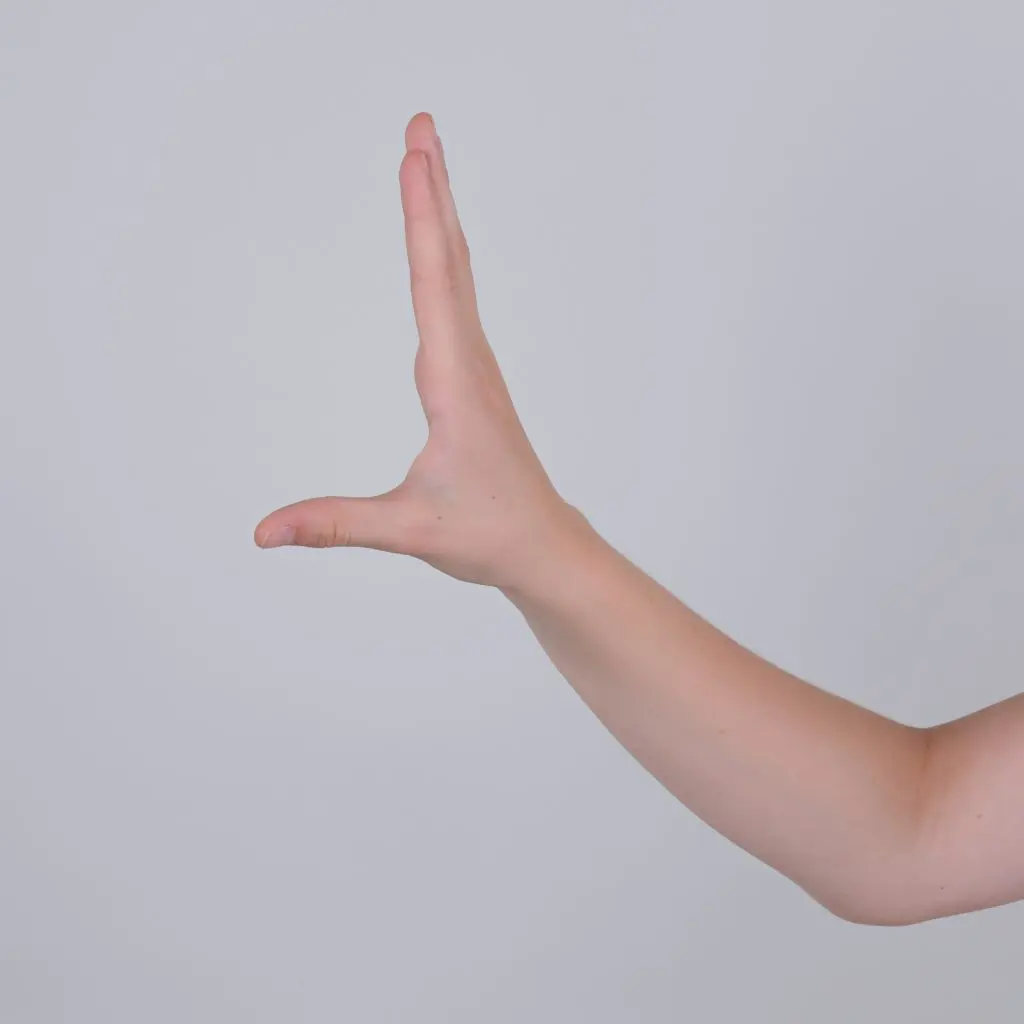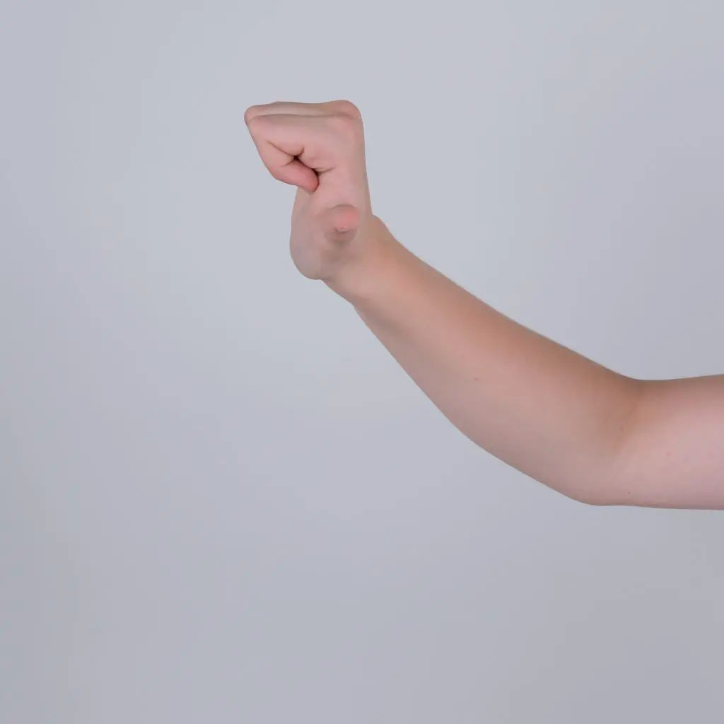Hold en træningselastik i den raske hånd foran skulderen på træningsarmen. Grib med hånden på træningsarmen om den anden ende af træningselastikken med albuen bøjet. Stræk langsomt træningsarmen ned mod gulvet, så elastikken strammes. Hold spændingen i få sekunder og bøj langsomt armen tilbage til udgangspositionen.