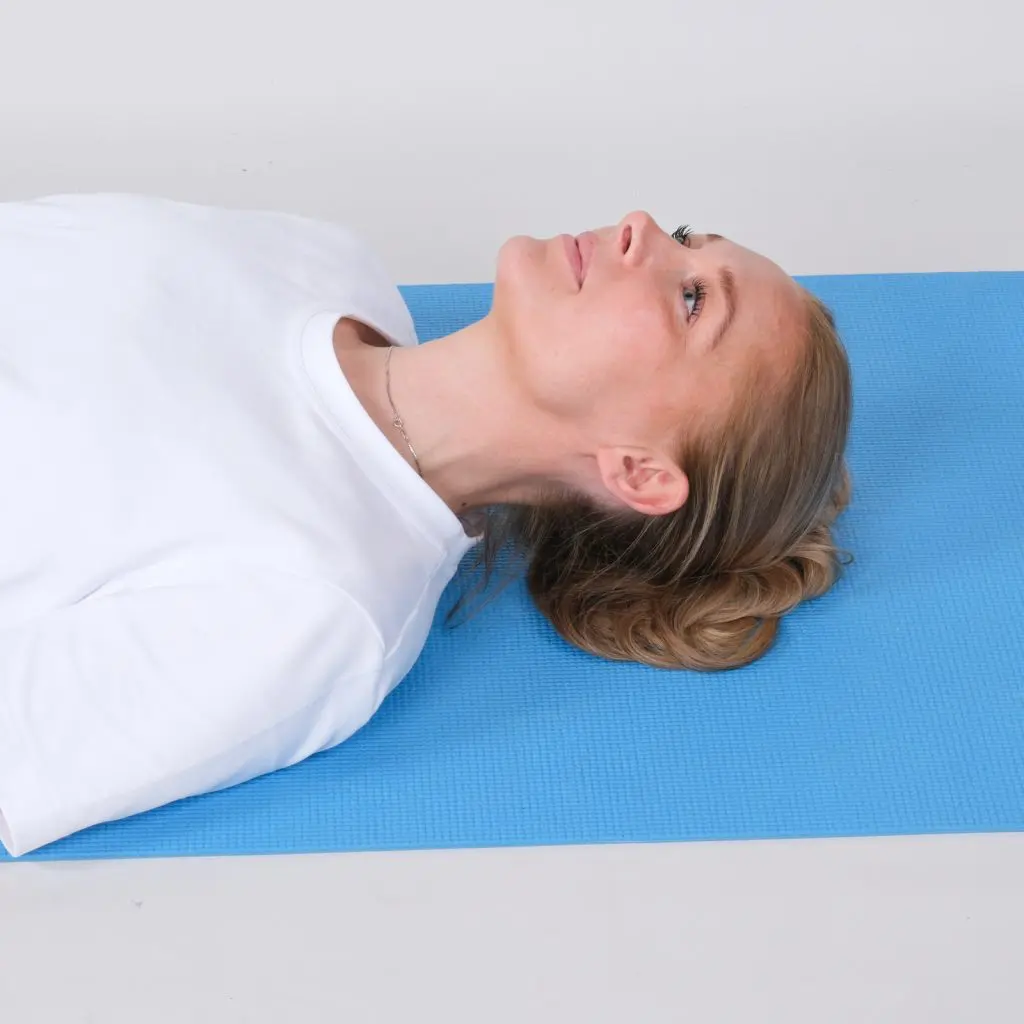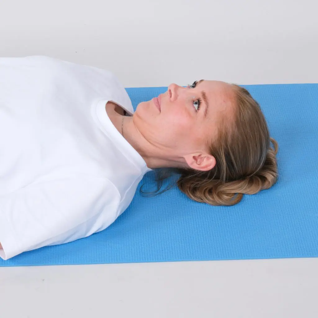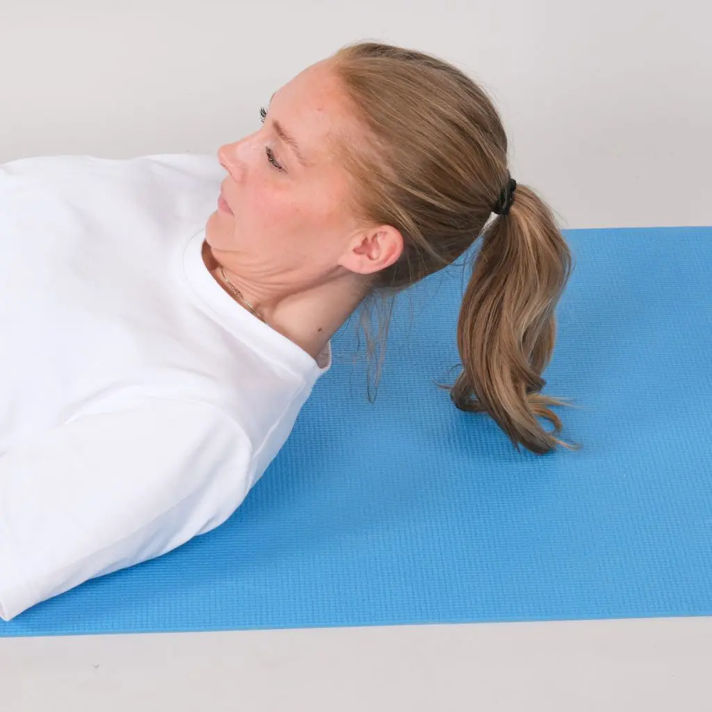 Lig på ryggen. Træk hagen ind mod brystet, så du får ”dobbelthage”. Løft hovedet, så hagen kommer tæt på brystbenet. Hold spændingen i få sekunder og sænk hovedet til udgangspositionen.