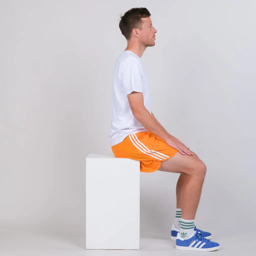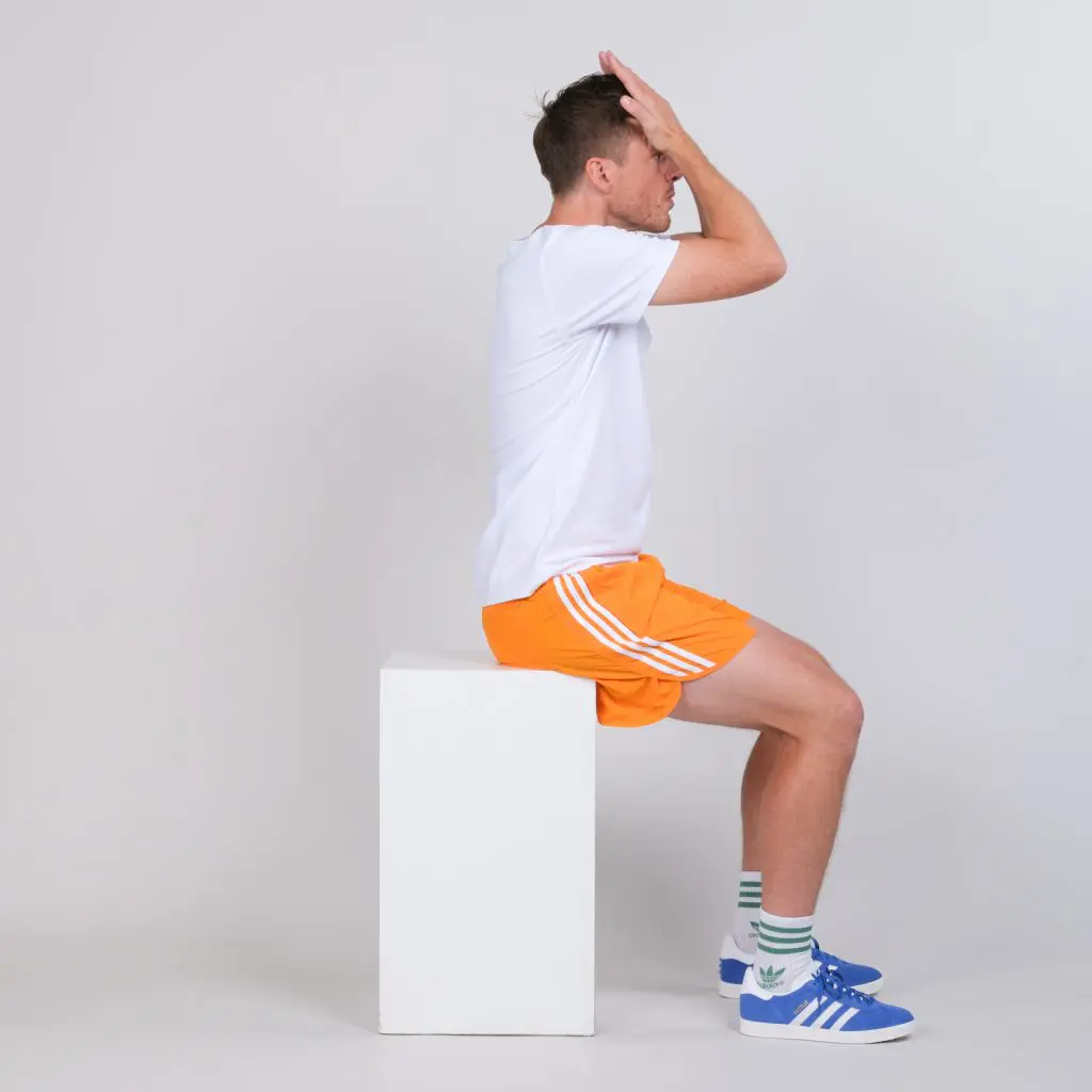 Sid på en stol. Ret ryggen. Se ligefrem og træk hagen ind mod brystet, så du får ”dobbelthage”. Læg øret ned mod skulderen og hold stillingen få sekunder. Gentag øvelse på modsatte side.