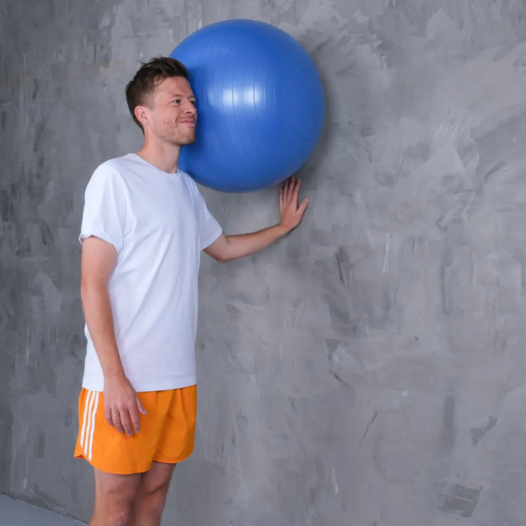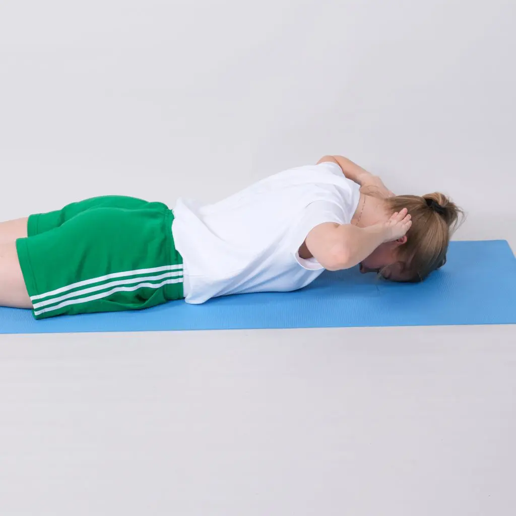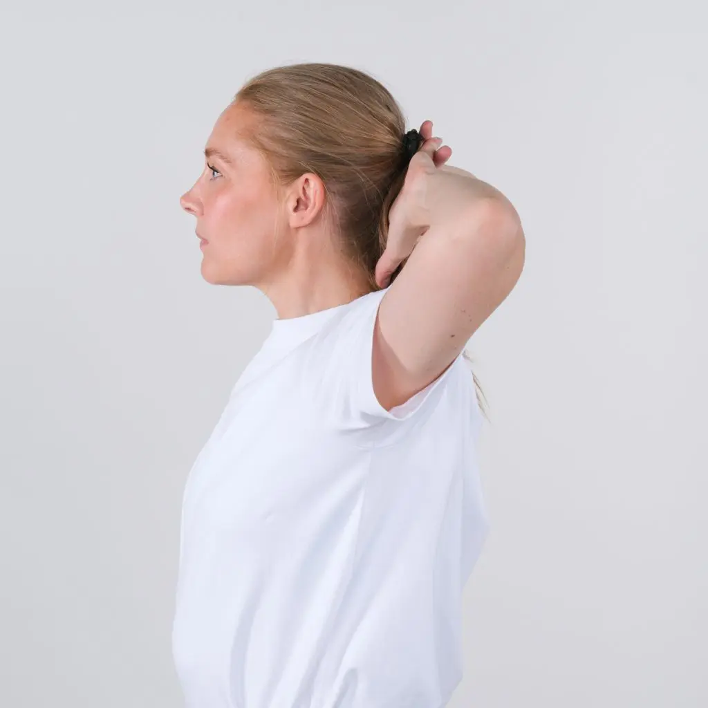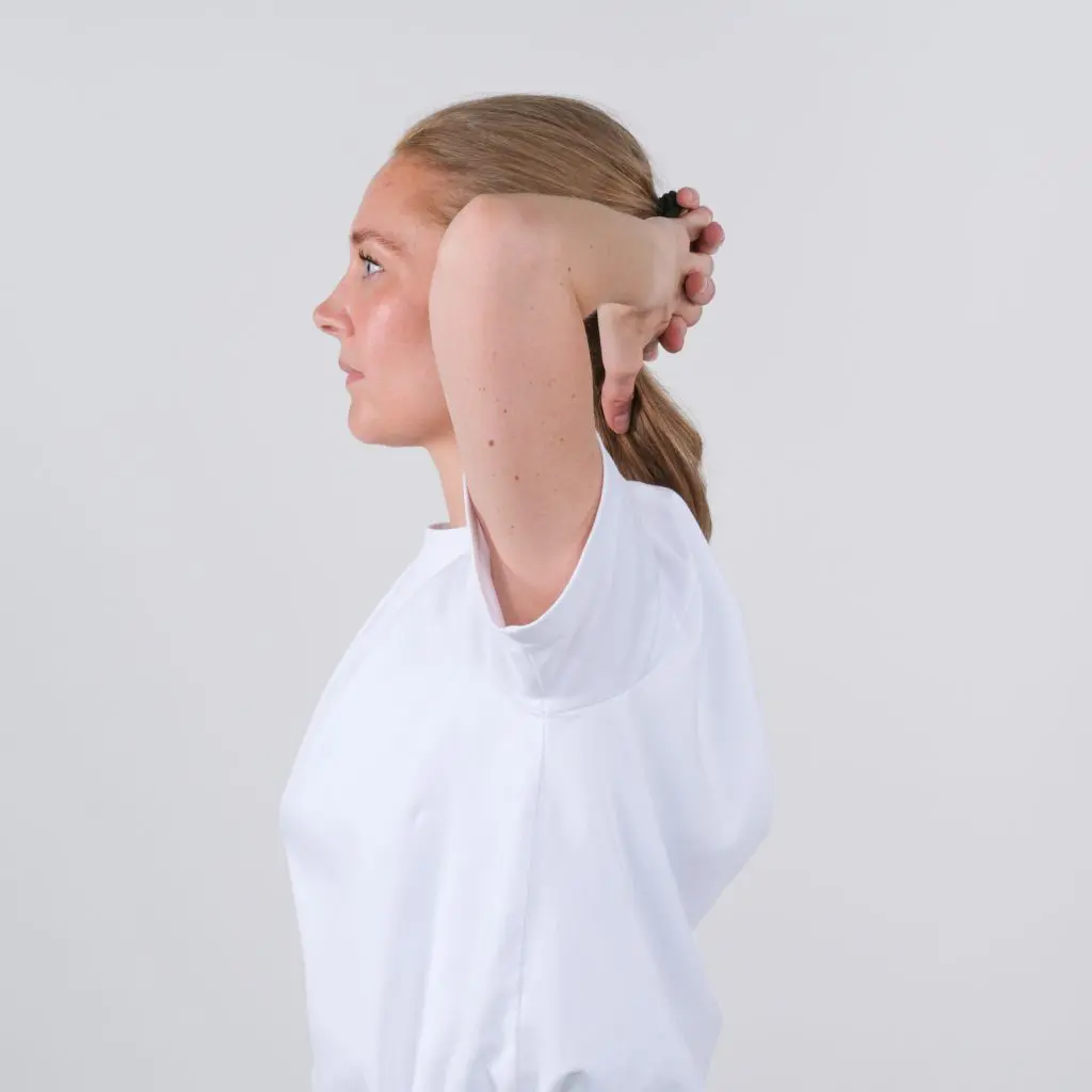 Hold højre arm strakt ned langs kroppen. Drej hånden indad (så tommelfingeren peger bagud) og før armen bagud og nedad. Træk hagen ind og bøj hovedet til modsatte side. Træk blidt med venstrehånd bag nakken, så der kommer tiltagende udspænding af de højresidige nakke-skulder-muskler. Hold udspændingen i 20 sekunder. Gentag øvelsen på modsatte side.