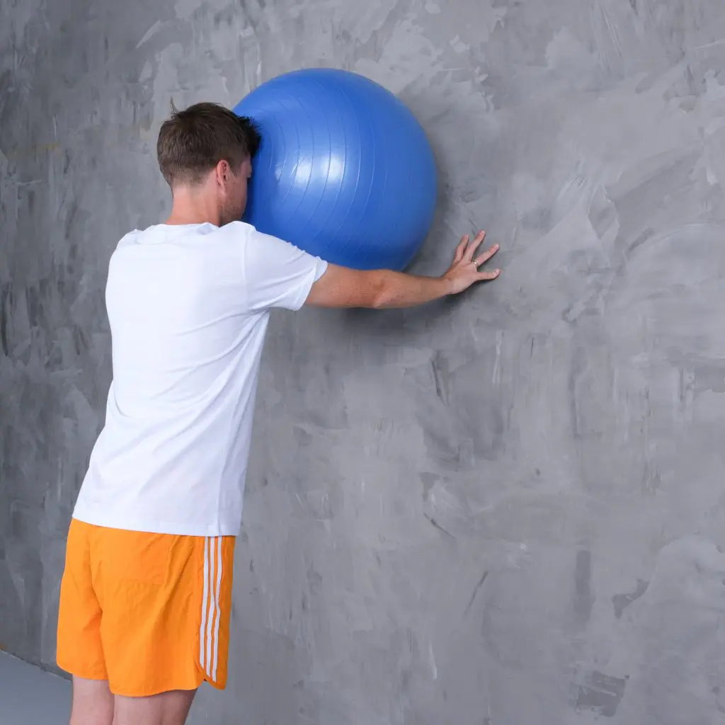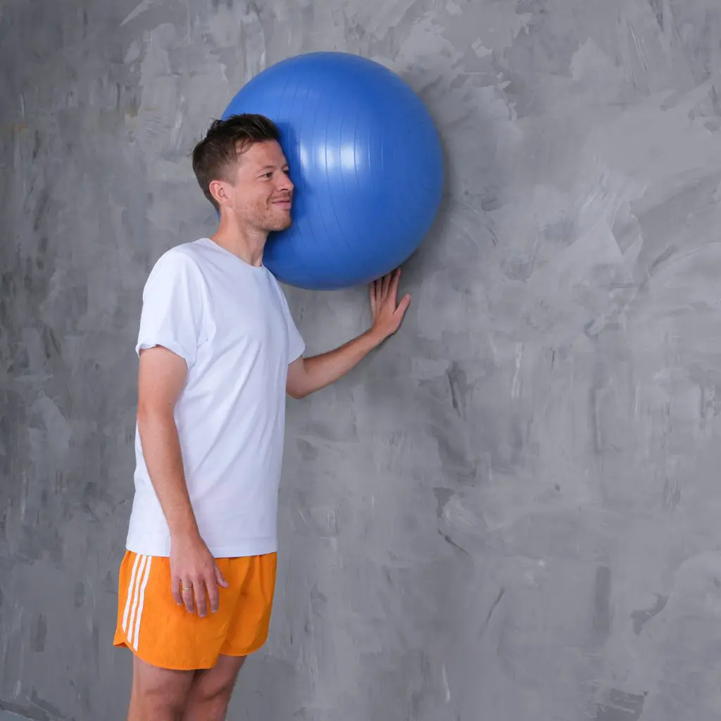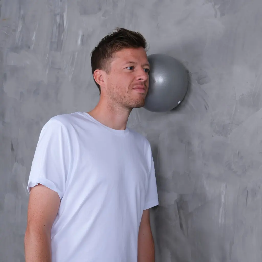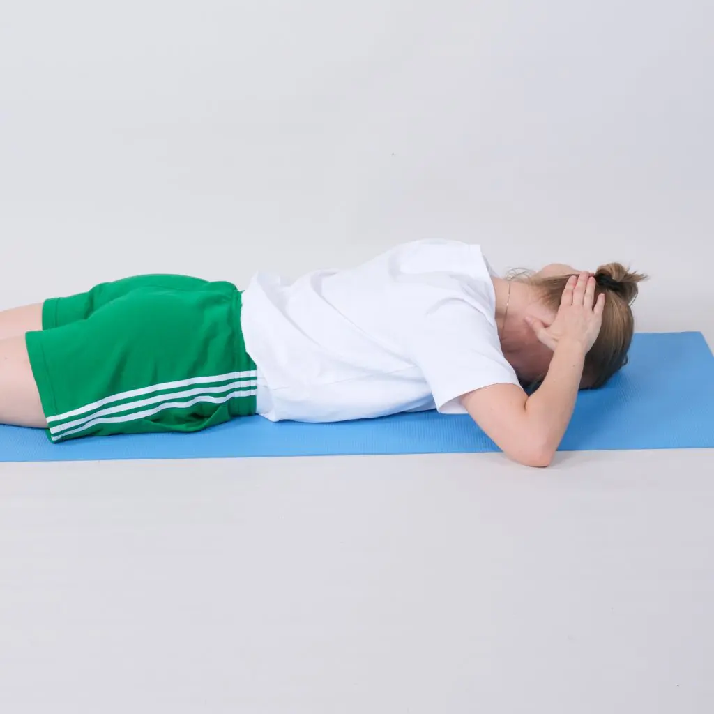 Hold højre arm strakt ned langs kroppen. Drej hånden indad (så tommelfingeren peger bagud) og før armen bagud og nedad. Træk hagen ind og bøj hovedet til modsatte side. Træk blidt med venstrehånd bag nakken, så der kommer tiltagende udspænding af de højresidige nakke-skulder-muskler. Hold udspændingen i 20 sekunder. Gentag øvelsen på modsatte side.
