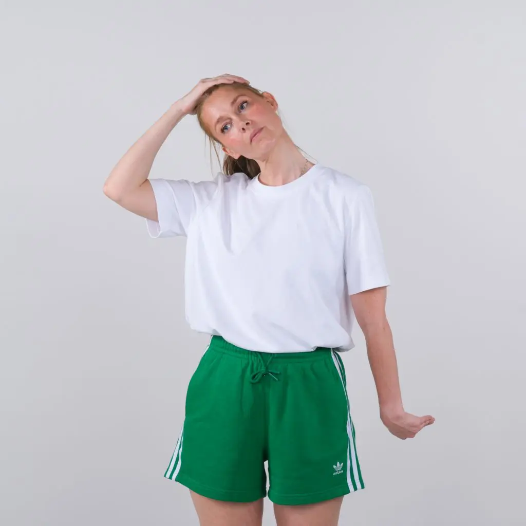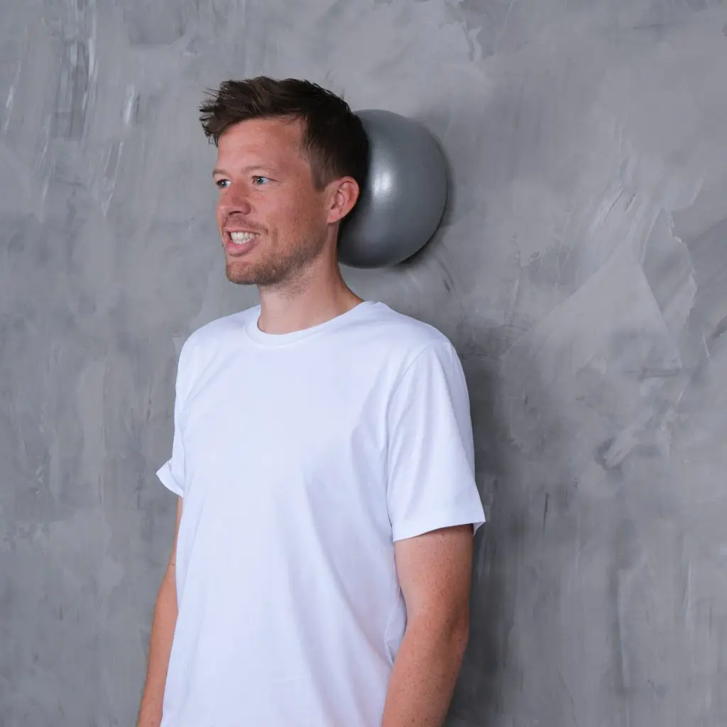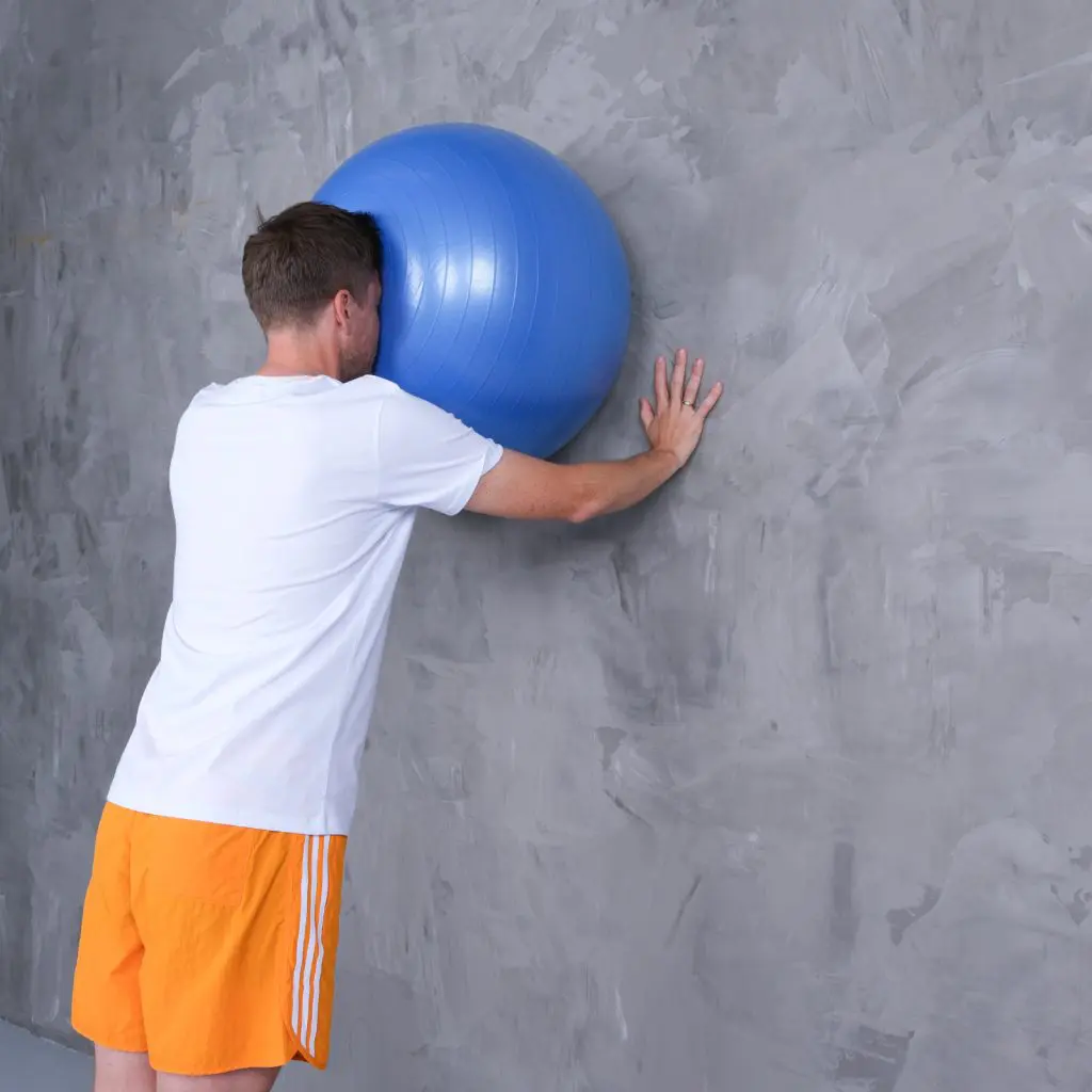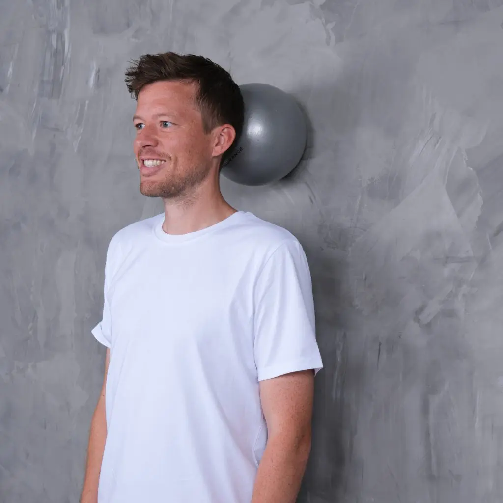 Hold højre arm strakt ned langs kroppen. Drej hånden indad (så tommelfingeren peger bagud) og før armen bagud og nedad. Træk hagen ind og bøj hovedet til modsatte side. Træk blidt med venstrehånd bag nakken, så der kommer tiltagende udspænding af de højresidige nakke-skulder-muskler. Hold udspændingen i 20 sekunder. Gentag øvelsen på modsatte side.