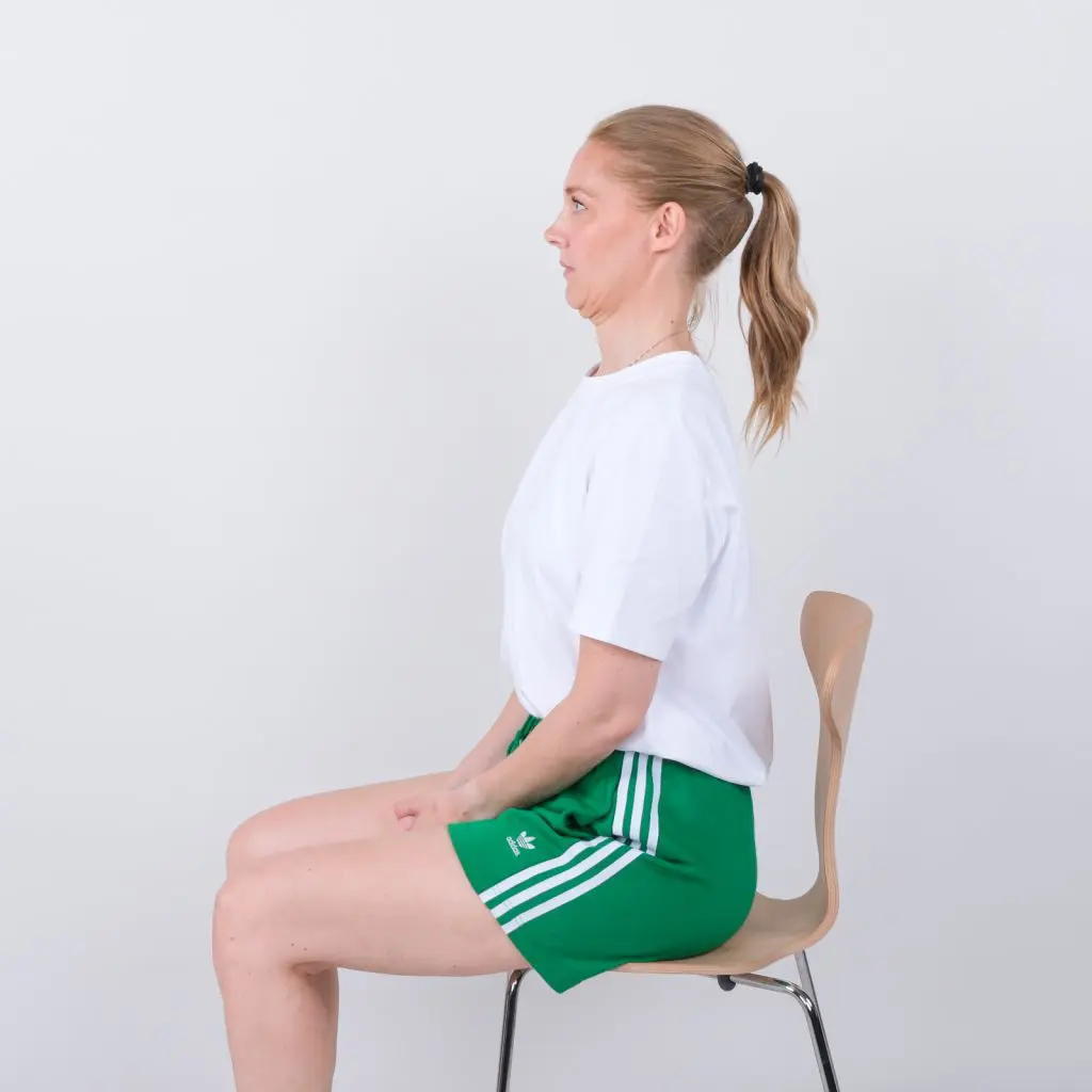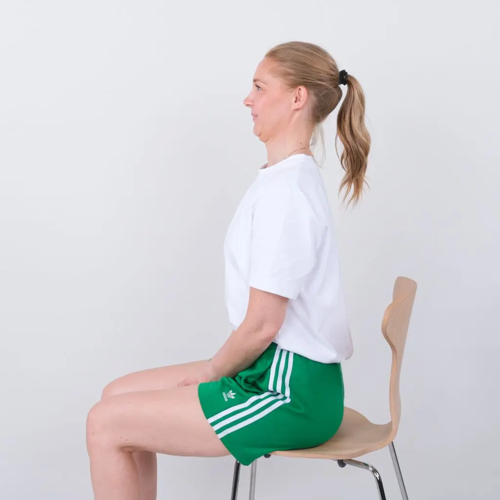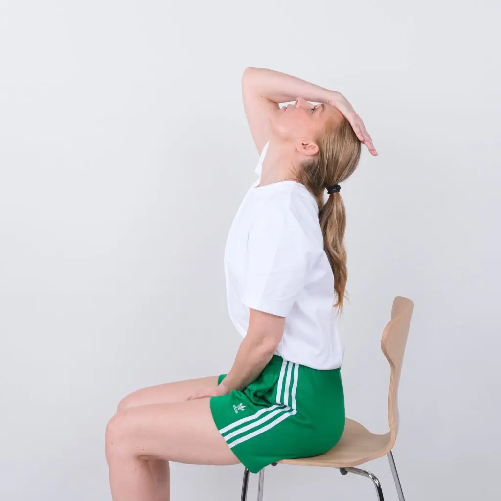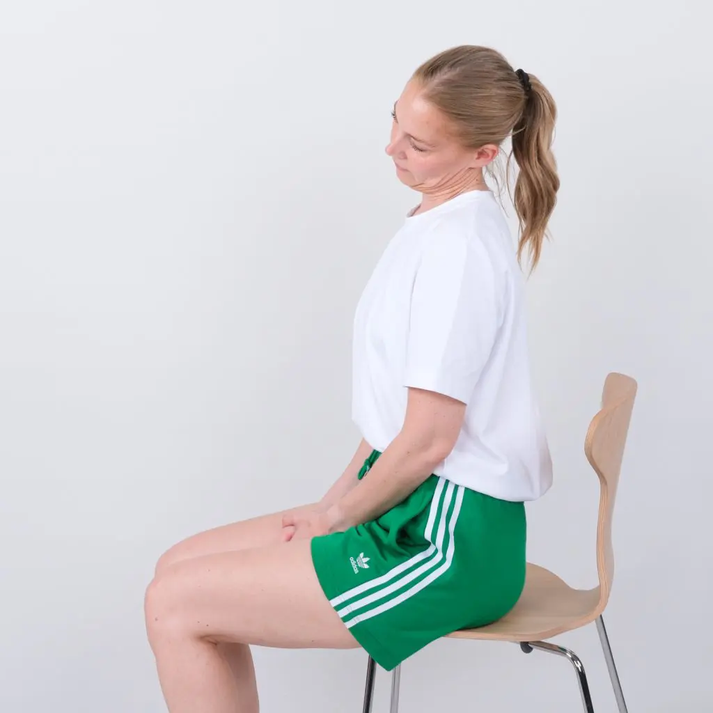 Sid på en stol. Læg venstre hånd op på højre side af hovedet, mens den højre hånd holder fast i stolesædet. Træk hovedet stille til venstre og hold igen med højre arm, så der kommer tiltagende udspænding af højre side af halsen. Træk hovedet i forskellige retninger (fremad/bagud) så alle musklerne omkring halsen udspændes. Hold udspændingen hver gang i 20 sekunder. Gentag øvelsen på modsatte side.
