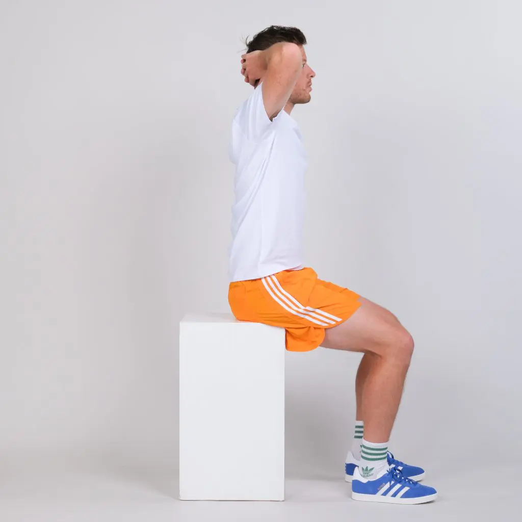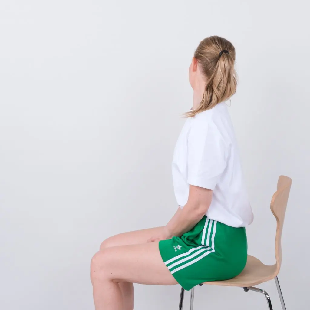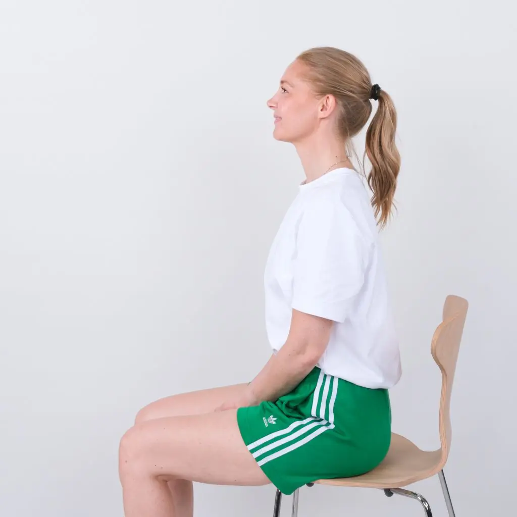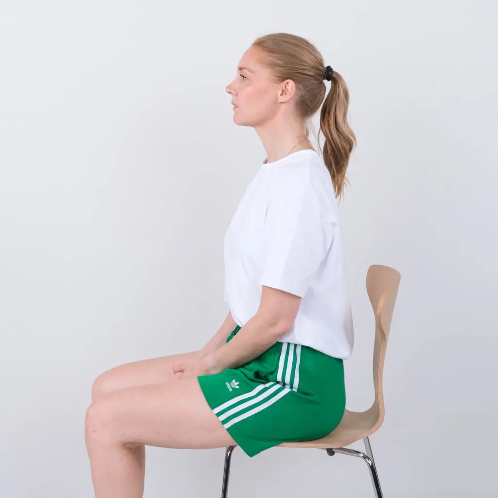 Sid på en stol. Læg venstre hånd op på højre side af hovedet, mens den højre hånd holder fast i stolesædet. Træk hovedet stille til venstre og hold igen med højre arm, så der kommer tiltagende udspænding af højre side af halsen. Træk hovedet i forskellige retninger (fremad/bagud) så alle musklerne omkring halsen udspændes. Hold udspændingen hver gang i 20 sekunder. Gentag øvelsen på modsatte side.