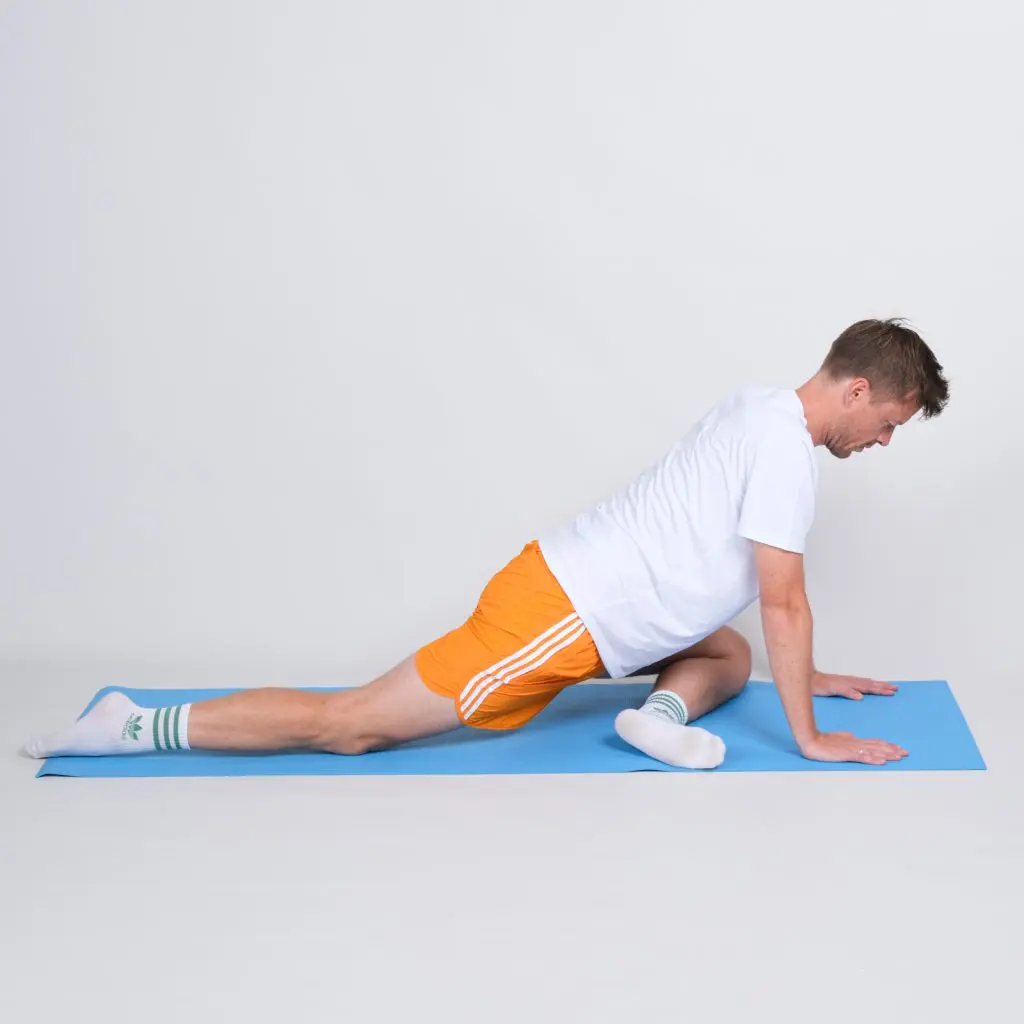 Sit on the floor with your left leg bent so that your lower leg is in front of your body. The right leg is stretched backwards. Bend your upper body down over your front leg to increase the stretch. Hold the press for 15 seconds, then lift your upper body back to the starting position and repeat the exercise on the opposite side.