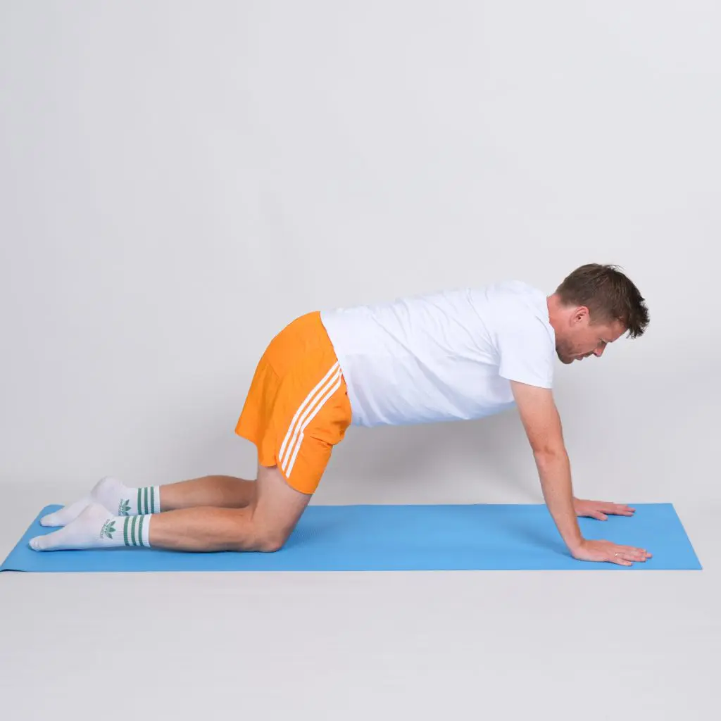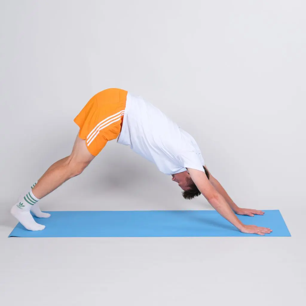 ”Fjeldstilling”. Sid på gulvet på knæene, der er bøjet 90 grader. Støt med strakte, lodrette arme, hvor hænderne er placeret lige under skuldrene, og hvor fingrene vender fremad. Hold ryggen lige og nakken/hovedet i forlængelse af resten af ryggen. Løft knæene op fra gulvet og stræk knæene så meget som muligt. Løft bækkenet op mod loftet og forsøg at holde hælene i gulvet. Hovedet føres ind mellem de strakte arme. Hold stillingen i 15 sekunder, og gå langsomt tilbage til udgangspositionen.