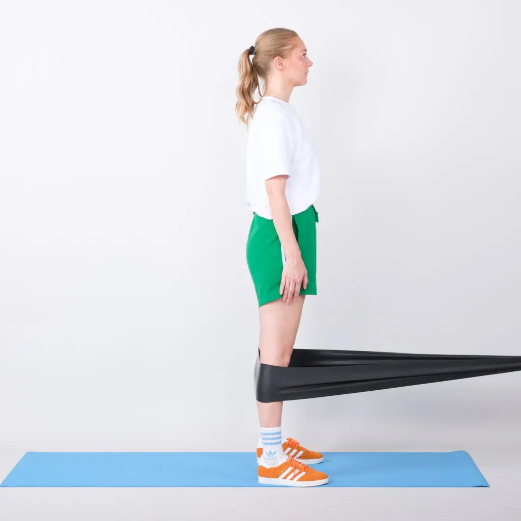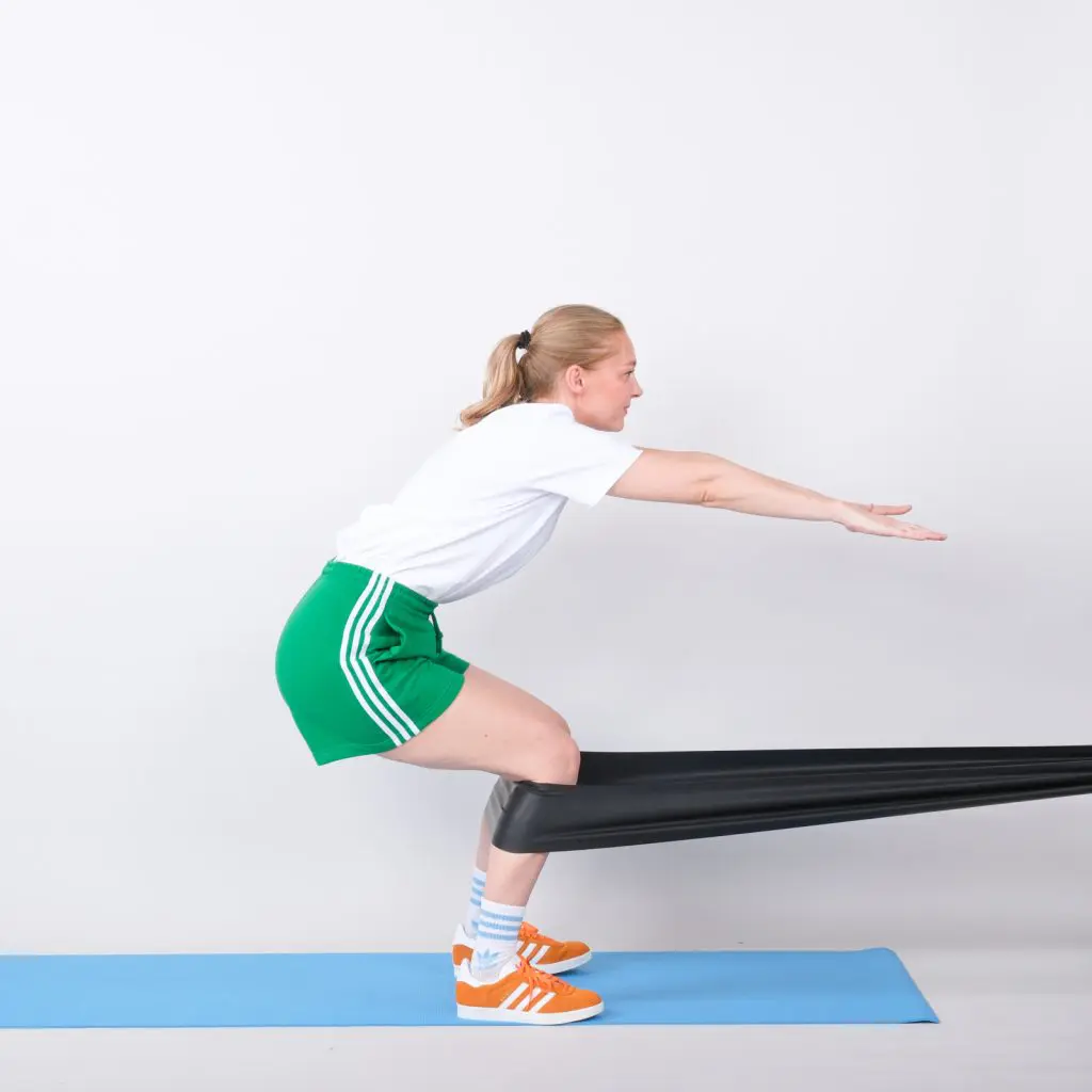 Fastgør en træningselastik i knæhøjde. Stå ret op med ansigtet mod træningselastikken, der føres rundt om underbenene lige under knæhaserne. Bøj 90 grader i hofter og knæ så låret er vandret og underben lodret og stræk armene lige frem. Hold stillingen i få sekunder. Stræk derefter knæene, så du står ret op i udgangspositionen.
