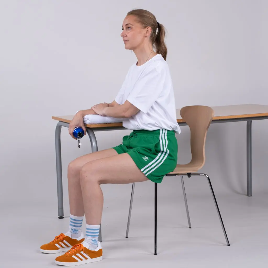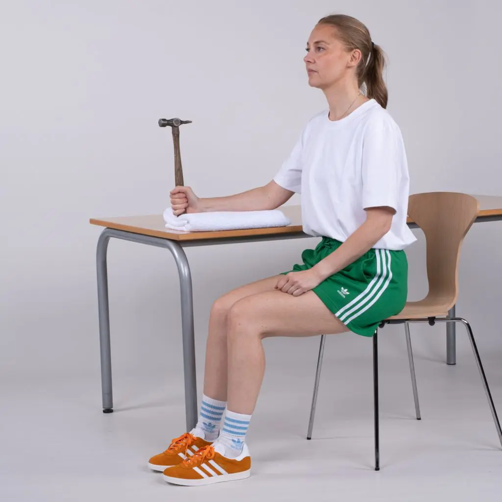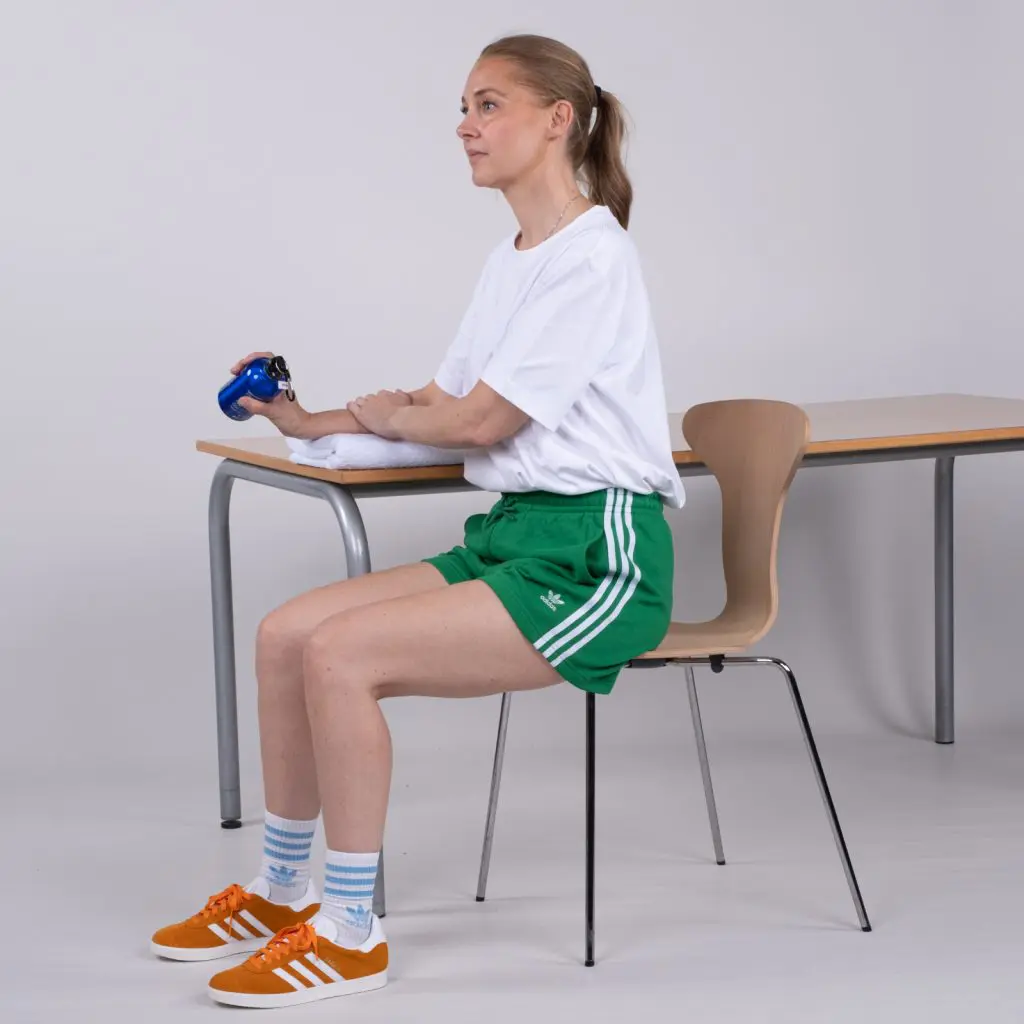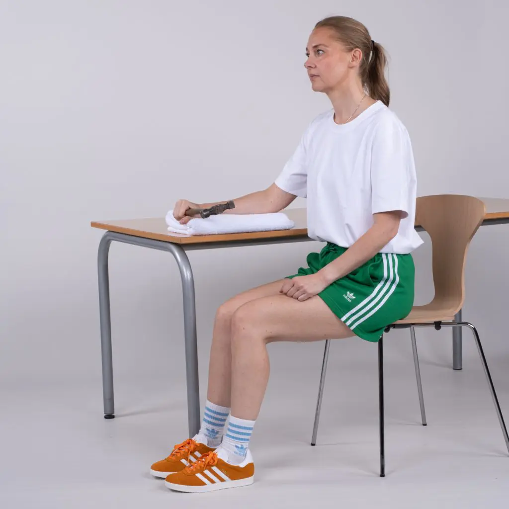Læg træningsarmen ud over kanten af et bord med håndfladen ned af. Pres med den anden arm på håndryggen, så der kommer tiltagende udspænding på træningsarmens forside. Gentag øvelsen, hvor træningsarmens hånd presses til først den ene side og efterfølgende til den anden side. Til sidst vendes armen så håndfladen vender opad. Med den raske arm presses på håndfladen af hånden, så der kommer tiltagende udspænding på træningsarmens underside. Alle udspændingerne holdes i 20 sekunder, hvorefter der startes på en af de andre øvelser.