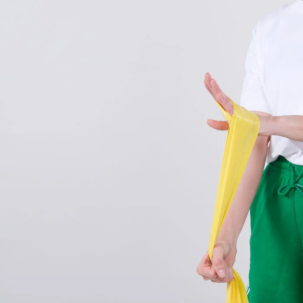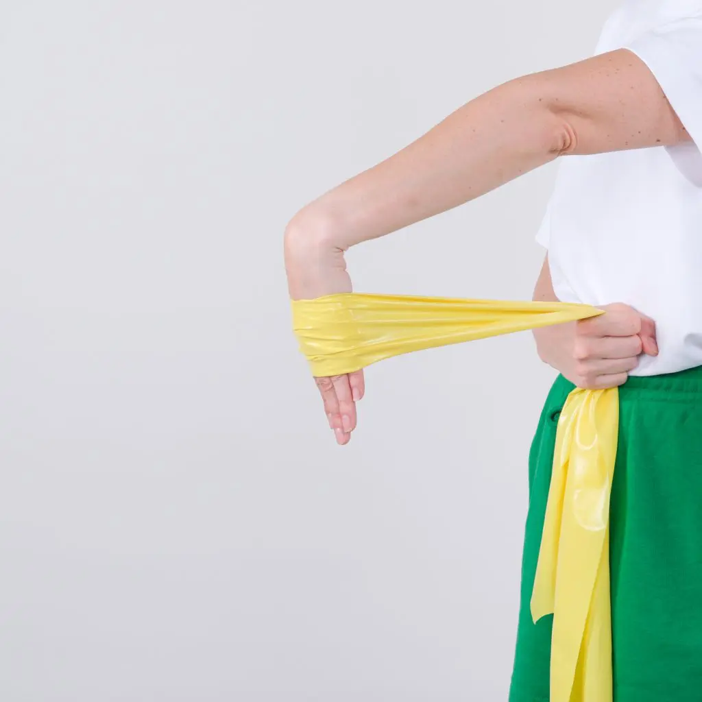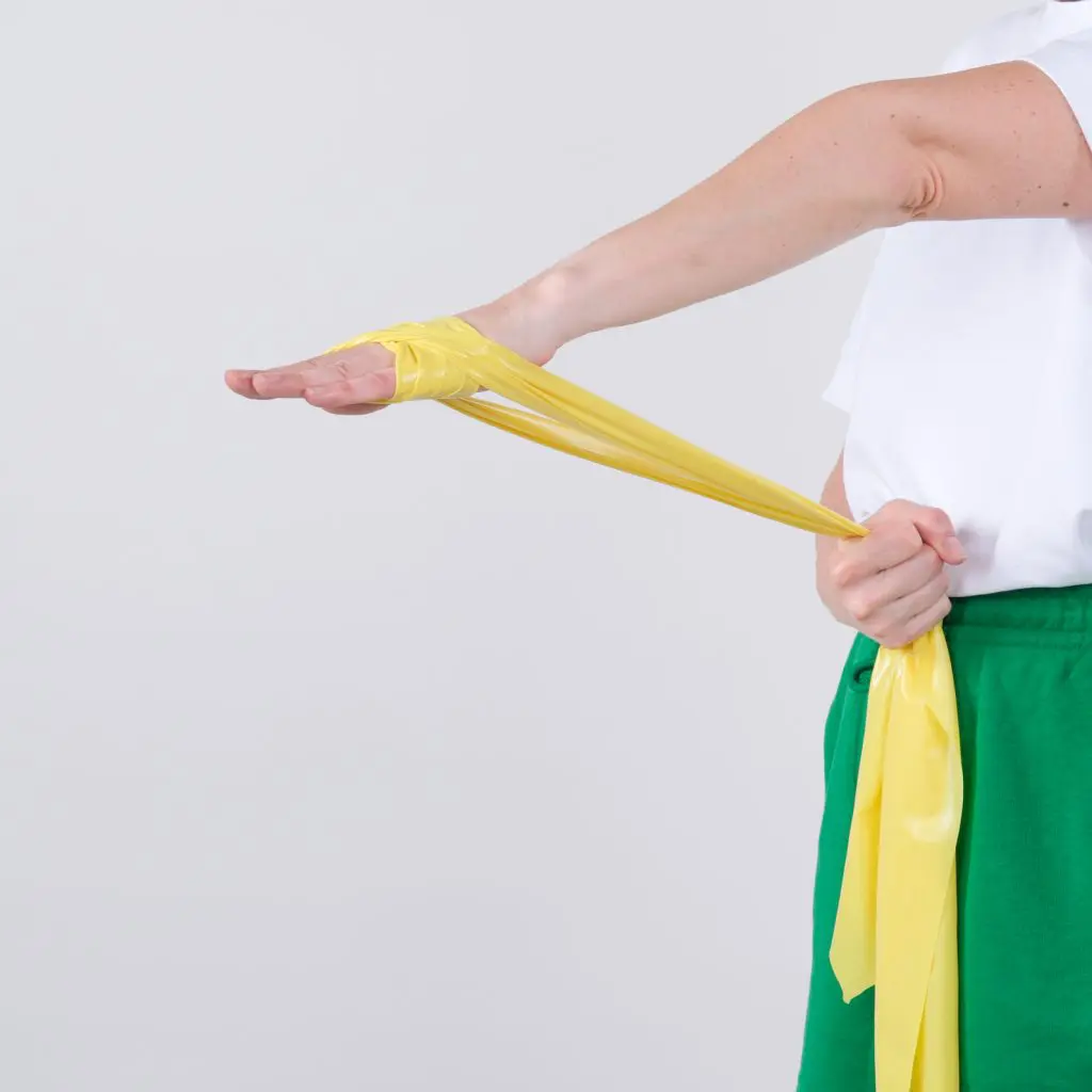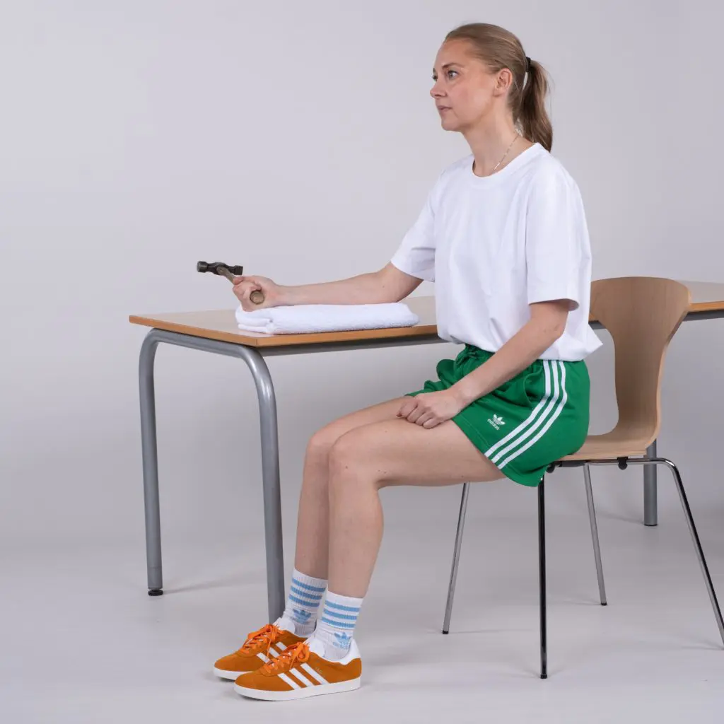 Sid med hånden ud over kanten af et bord. Håndryggen vender opad. Tag en træningselastik om håndryggen på træningsarmen. Hold fat i elastikken med den raske arm under bordet. Bevæg håndleddet langsomt opad, så elastikken strammes. Hold håndleddet i yderstilling med stram elastik i få sekunder, inden hånden tilbageføres til udgangsstillingen.
