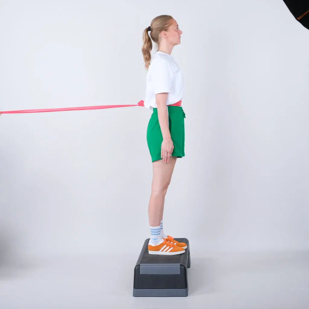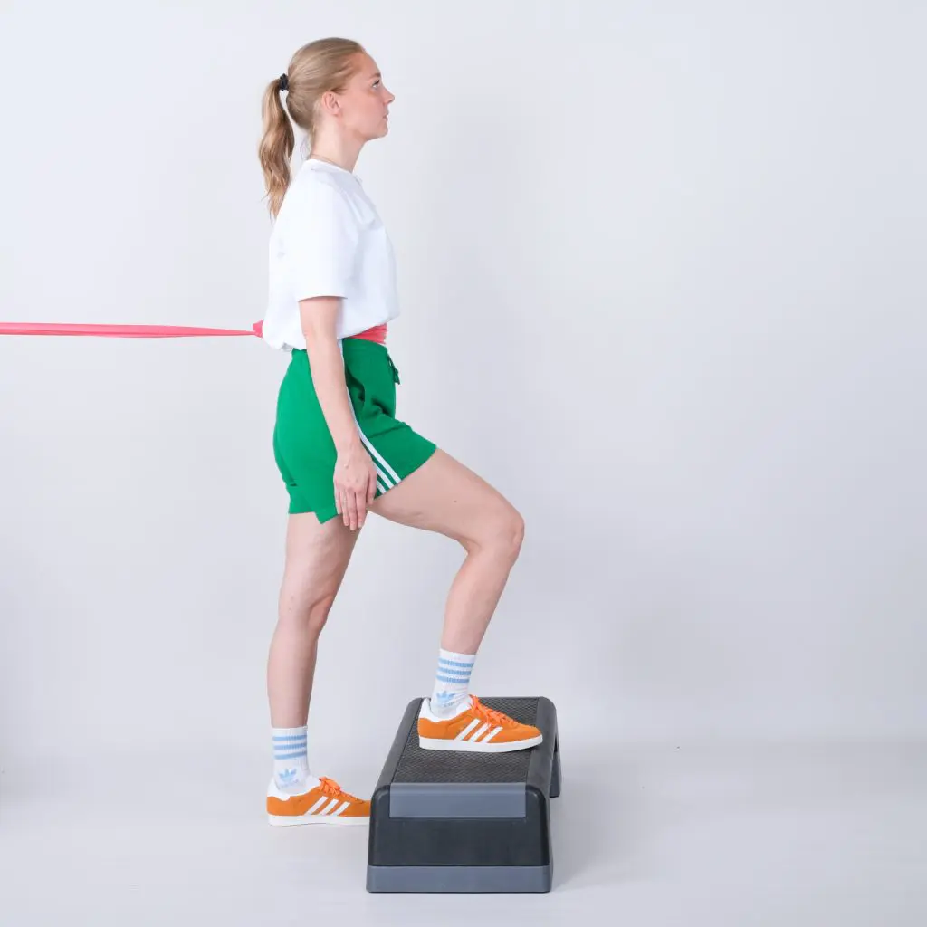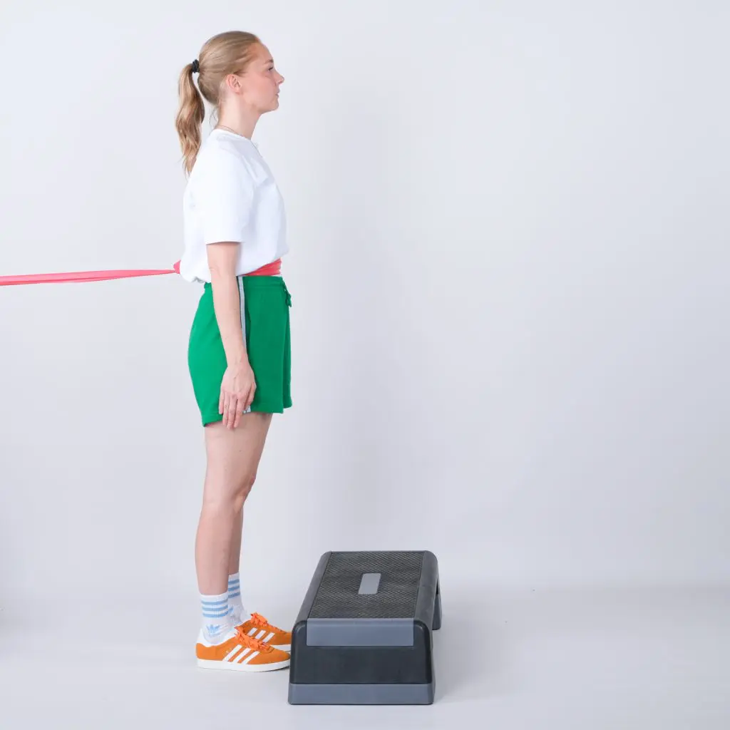 Stå foran en skammel/et trappetrin. Fastgør en træningselastik bag dig i brysthøjde. Før træningselastikken rundt om brystkassen gå op på skamlen i en langsom bevægelse. Saml benene på skamlen og gå langsomt ned igen.