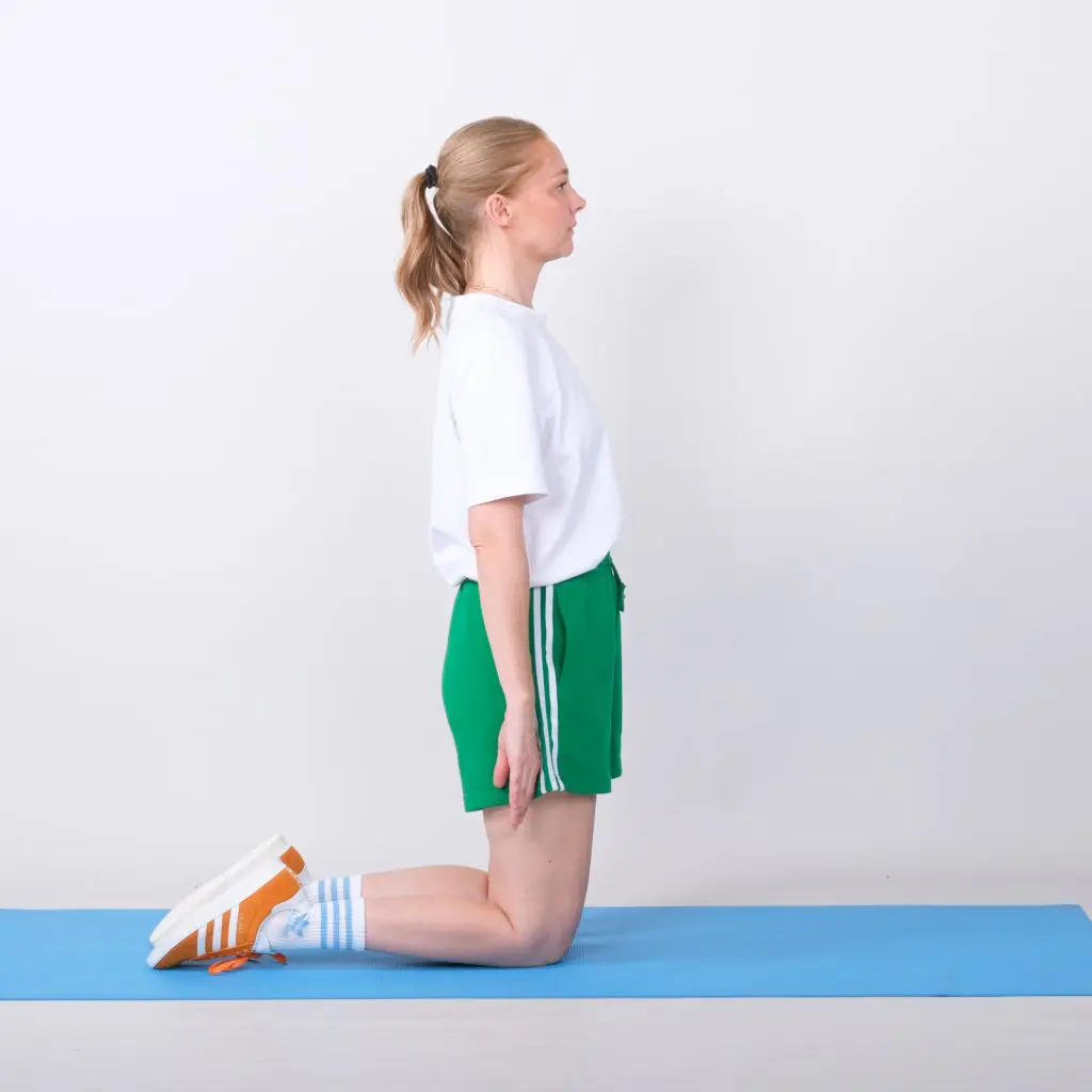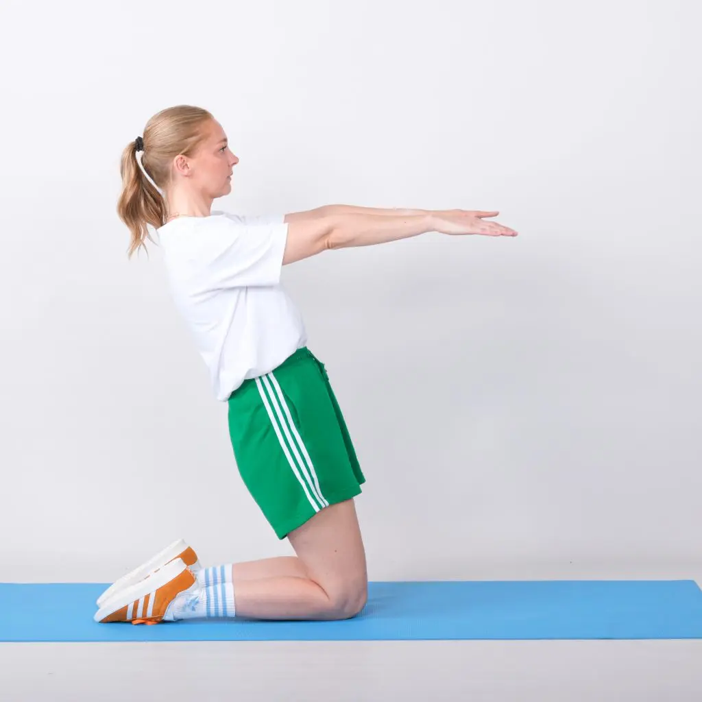 Sid på begge knæ med kroppen ret op og hænderne ned langs kroppen. Bøj i knæene og svaj bagover med ret ryg og hænderne strakt lige frem.