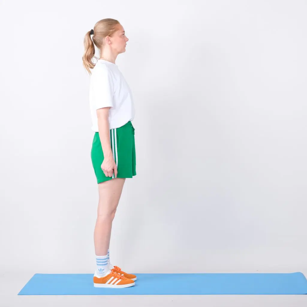 ”Lunges”. Stå oprejst med begge ben samlet. Gå frem på træningsbenet med bøjning på knæet til max 90 grader. Hold forreste knæ bag tæerne. Hold forreste fod i gulvet. Bøj i det bagerste ben og kom helt frem på tæerne på bagerste ben. Rejs dig op på samme ben og vend tilbage til udgangspositionen