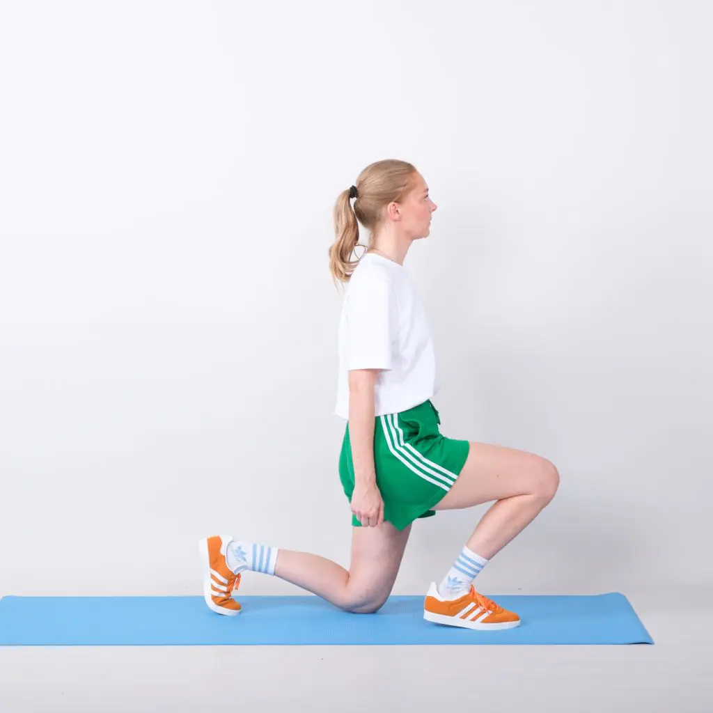 Stå med det ene ben på en stol, og det andet ben strakt bagud. Skyd vægten frem så der kommer tiltagende udspænding på forsiden af hoften. Hold udspændingen i 20 sekunder. Gentag øvelsen på modsatte ben.