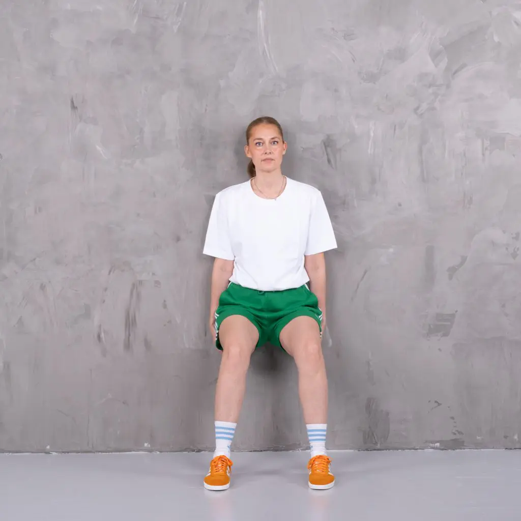 Stå med ryggen mod væggen og med vægten på begge ben. Bøj langsomt knæene til 90 grader og rejs dig roligt igen.