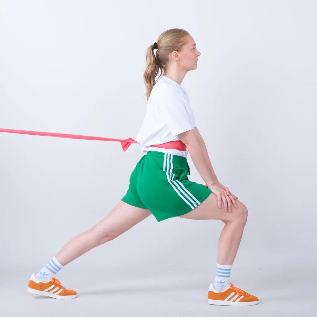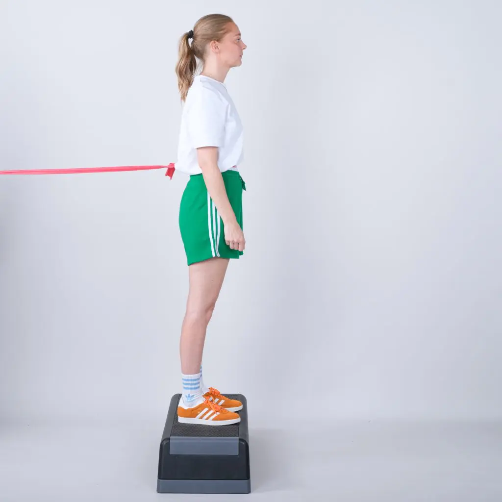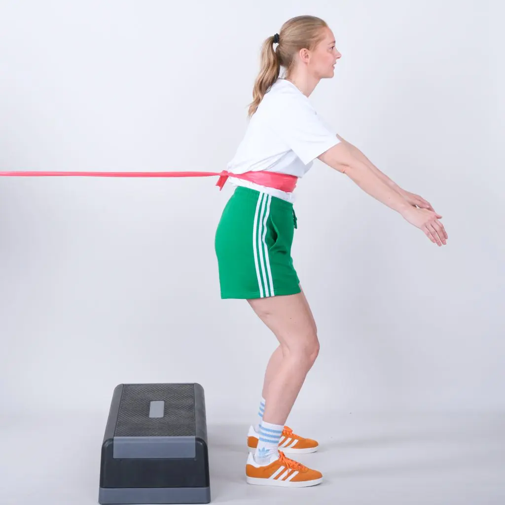 Fastgør en træningselastik i brysthøjde. Stå med ryggen mod træningselastikken og før træningselastikken om hoften/brystet. Stå oprejst med begge ben samlet. Gå frem på træningsbenet med bøjning på knæet til max 90 grader så elastikken strammes. Hold forreste knæ bag tæerne. Hold forreste fod i gulvet. Bøj i det bagerste ben og kom helt frem på tæerne på bagerste ben. Rejs dig op på samme ben og vend tilbage til udgangspositionen.