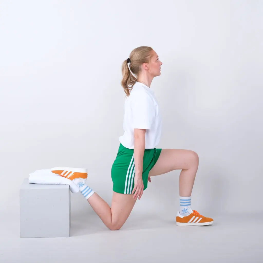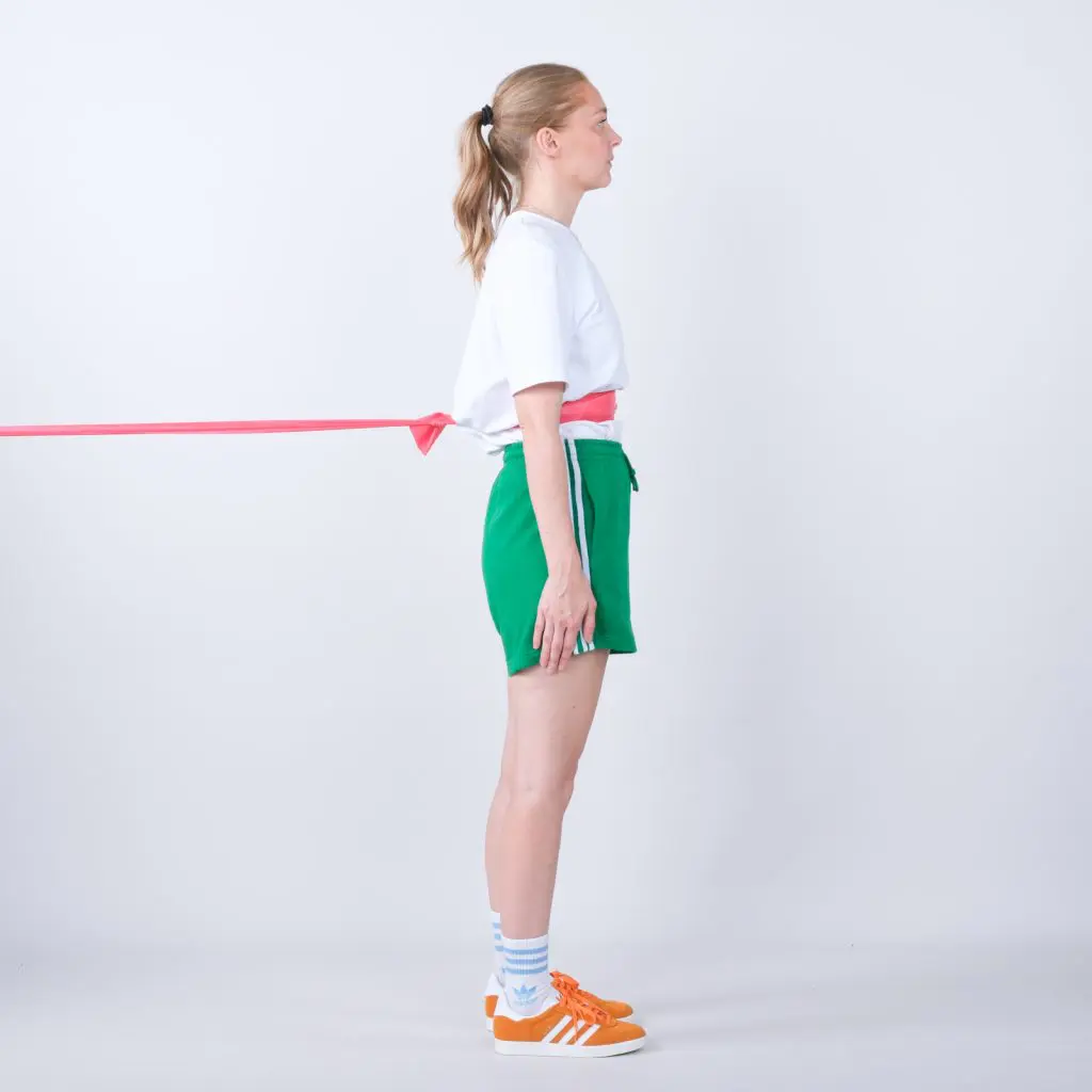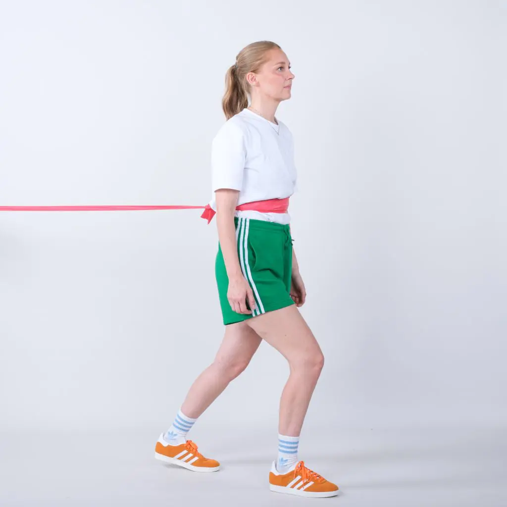 Fastgør en træningselastik i brysthøjde. Stå med ryggen mod træningselastikken og før træningselastikken om hoften/brystet. Stå oprejst med begge ben samlet. Gå frem på træningsbenet med bøjning på knæet til max 90 grader så elastikken strammes. Hold forreste knæ bag tæerne. Hold forreste fod i gulvet. Bøj i det bagerste ben og kom helt frem på tæerne på bagerste ben. Rejs dig op på samme ben og vend tilbage til udgangspositionen.