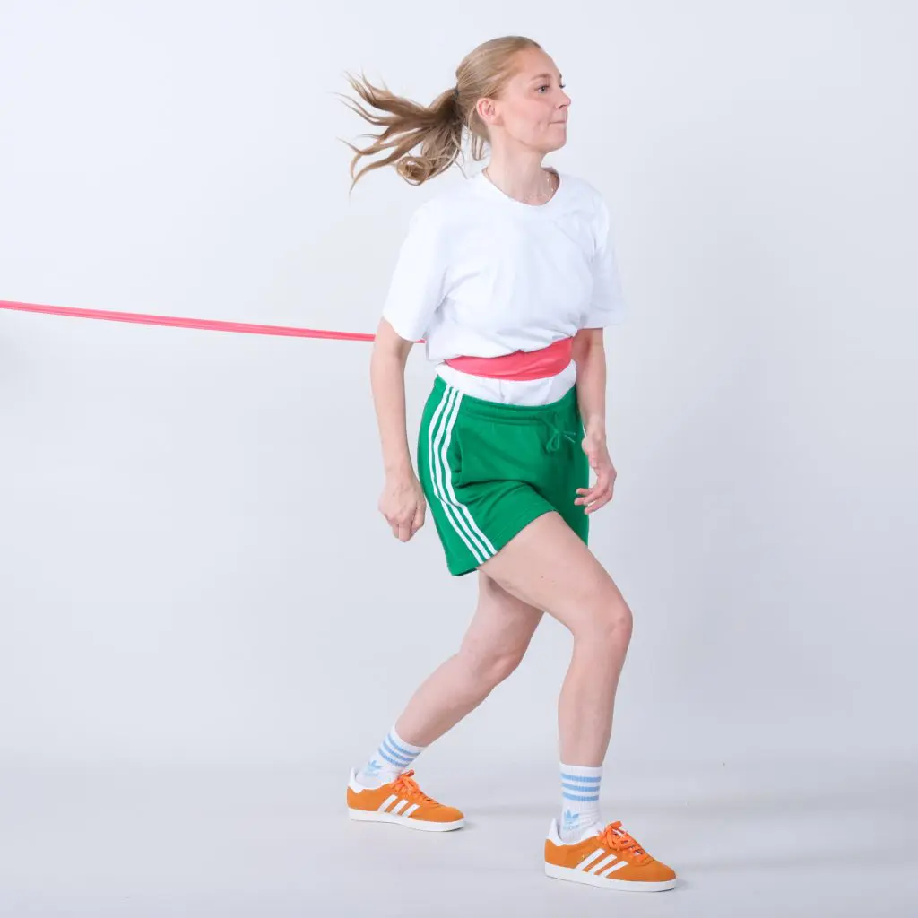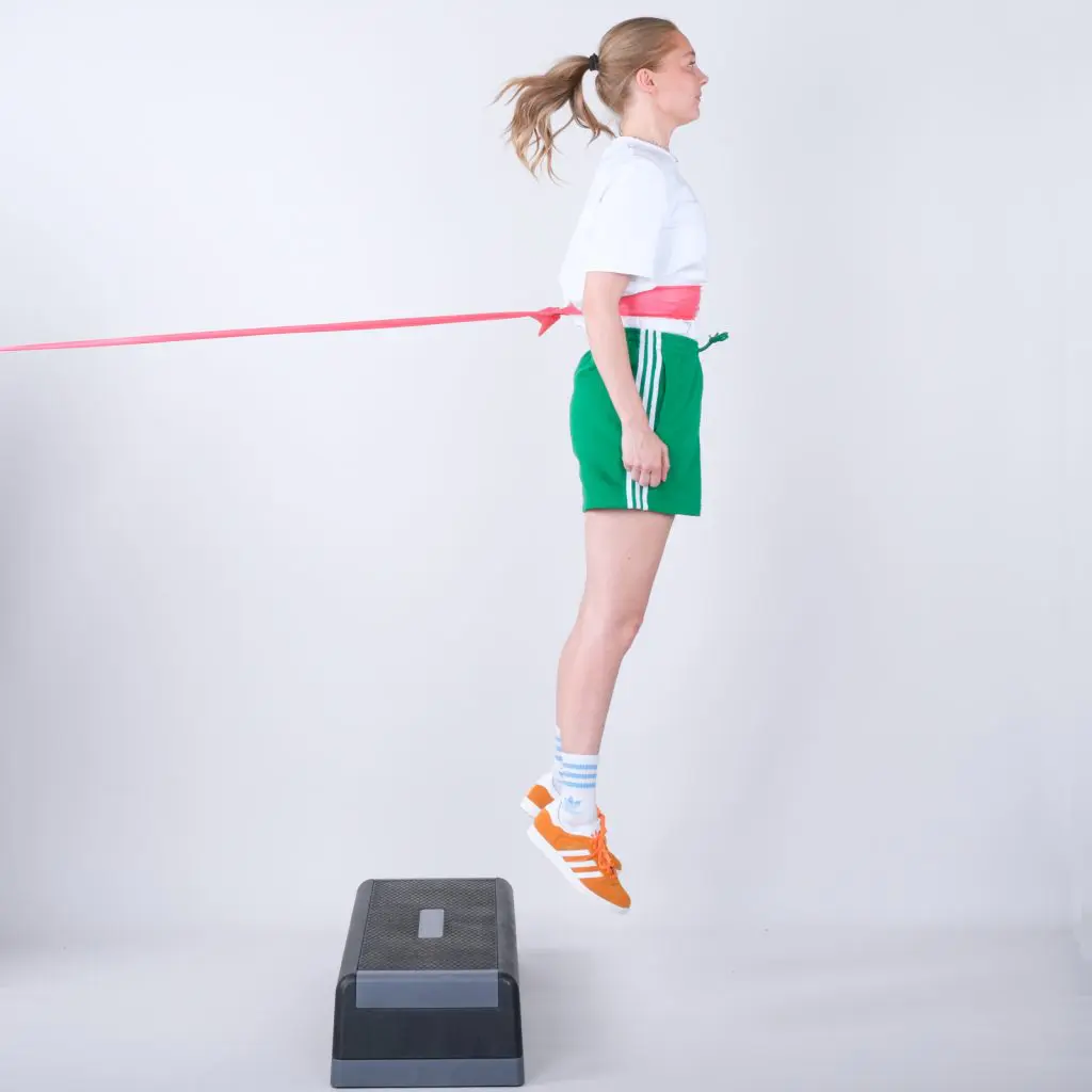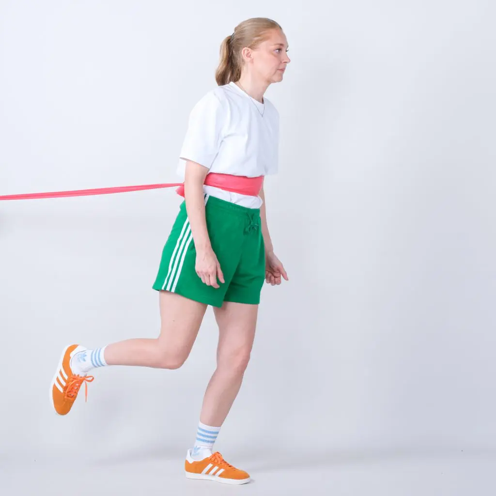 Fastgør en træningselastik i hoftehøjde. Stå med ryggen mod fæstet af træningselastikken. Læg træningselastik om maven/brystkassen. Stå på træningsbenet og spring et skrift frem og land på det andet ben, så elastikken strammes. Gå tilbage til udgangspositionen. Sæt skiftevis af med højre og venstre ben.