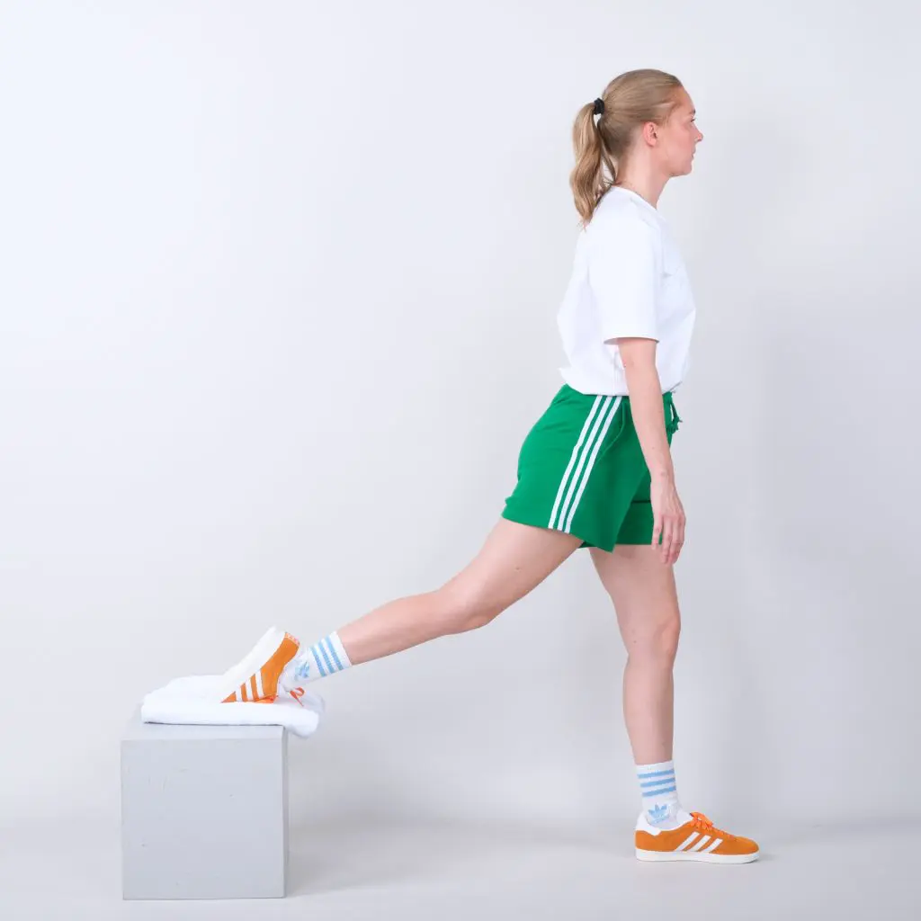 Stå på et ben. Støt med en hånd på en væg/stol. Bøj modsatte knæ og tag om foden med hånden på samme side. Træk foden op og knæet lidt bagud, så der kommer tiltagende udspænding af forlåret. Hold udspændingen i 20 sekunder. Gentag øvelsen skiftevis på højre og venstre ben. Øvelsen kan også udføres liggende på siden eller på maven.