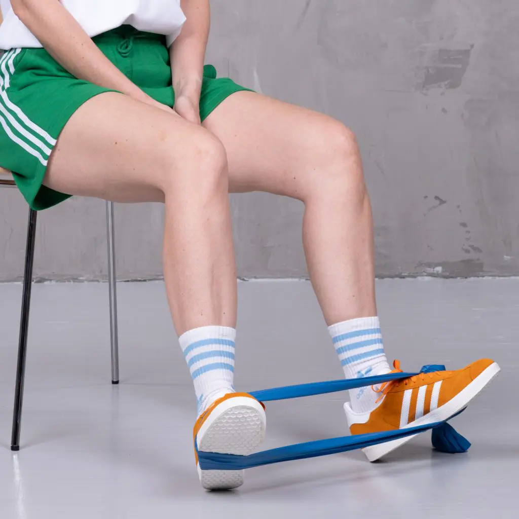 Sid på gulvet med strakt ben. En træningselastik føres omkring forfoden (fodsålen), og træningselastikken holdes i hånden. Stræk langsomt foden så elastikken strammes. Hold spændingen i få sekunder og før langsomt foden tilbage til udgangsposition.