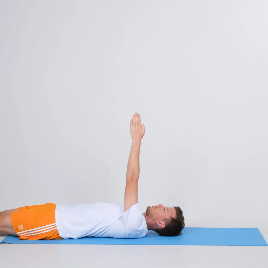Stand slightly bent over a chair/table. Support with your healthy arm. Let the training arm hang limply towards the floor. Lift your arm/shoulder straight up towards the ceiling by using your shoulder blade muscles. You can bend your arm when you lift your shoulder if you find it difficult to engage your shoulder blade muscles.