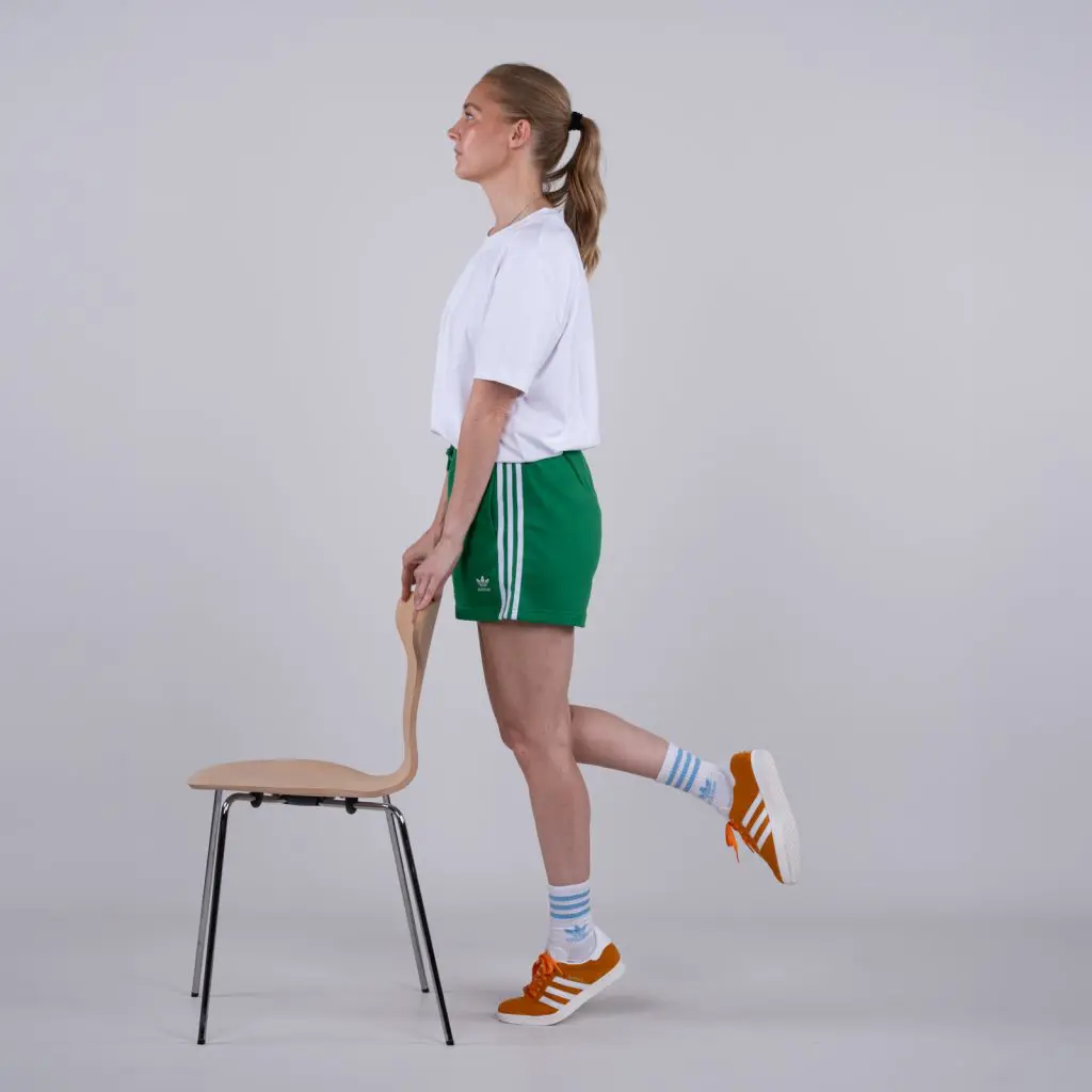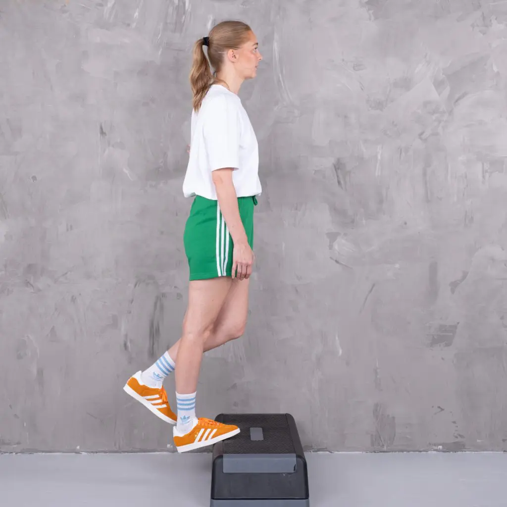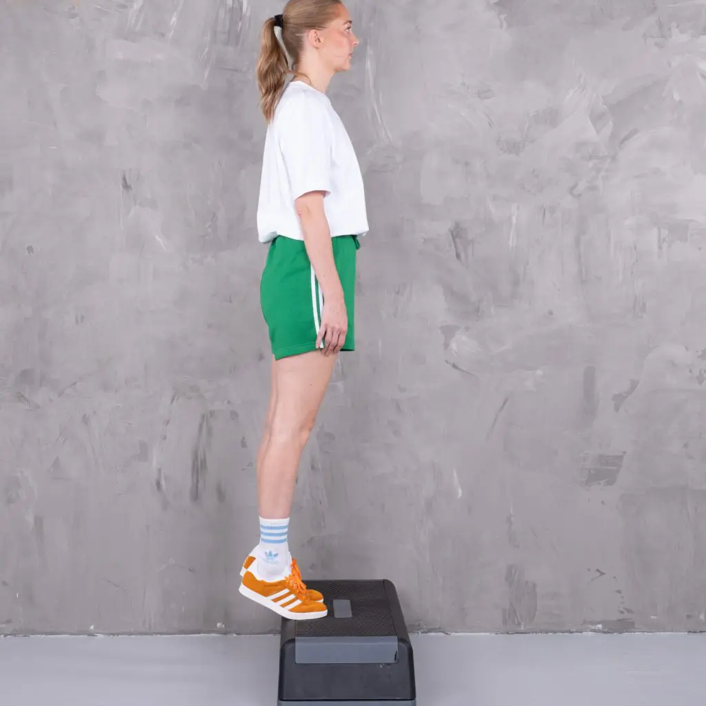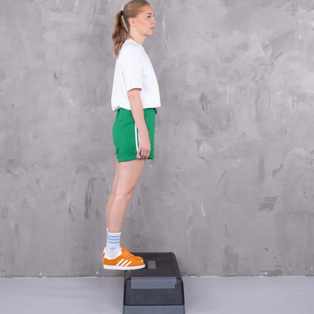 Stå på begge forfødder på et trappetrin med hælen ud over kanten. Rejs dig langsomt op på tæer med vægten på det raske ben. Sænk dig langsomt ned på træningsbenet, så langt du kan komme, så det strammer i lægmusklen. Brug det raske ben til at komme op på tæer igen. Støt evt. med en hånd på væggen. Øvelsen udføres skiftevis med strakt og bøjet knæ. Belastningen kan øges ved at tage en rygsæk på og efterhånden øge ballastningen i rygsækken.
