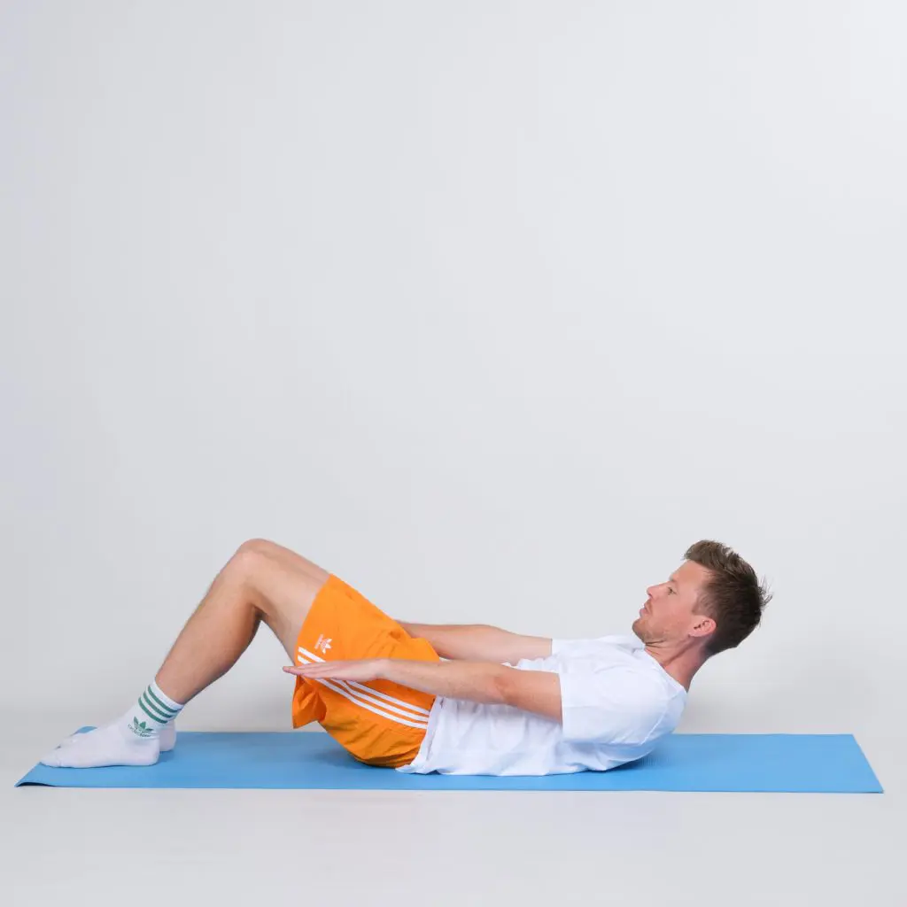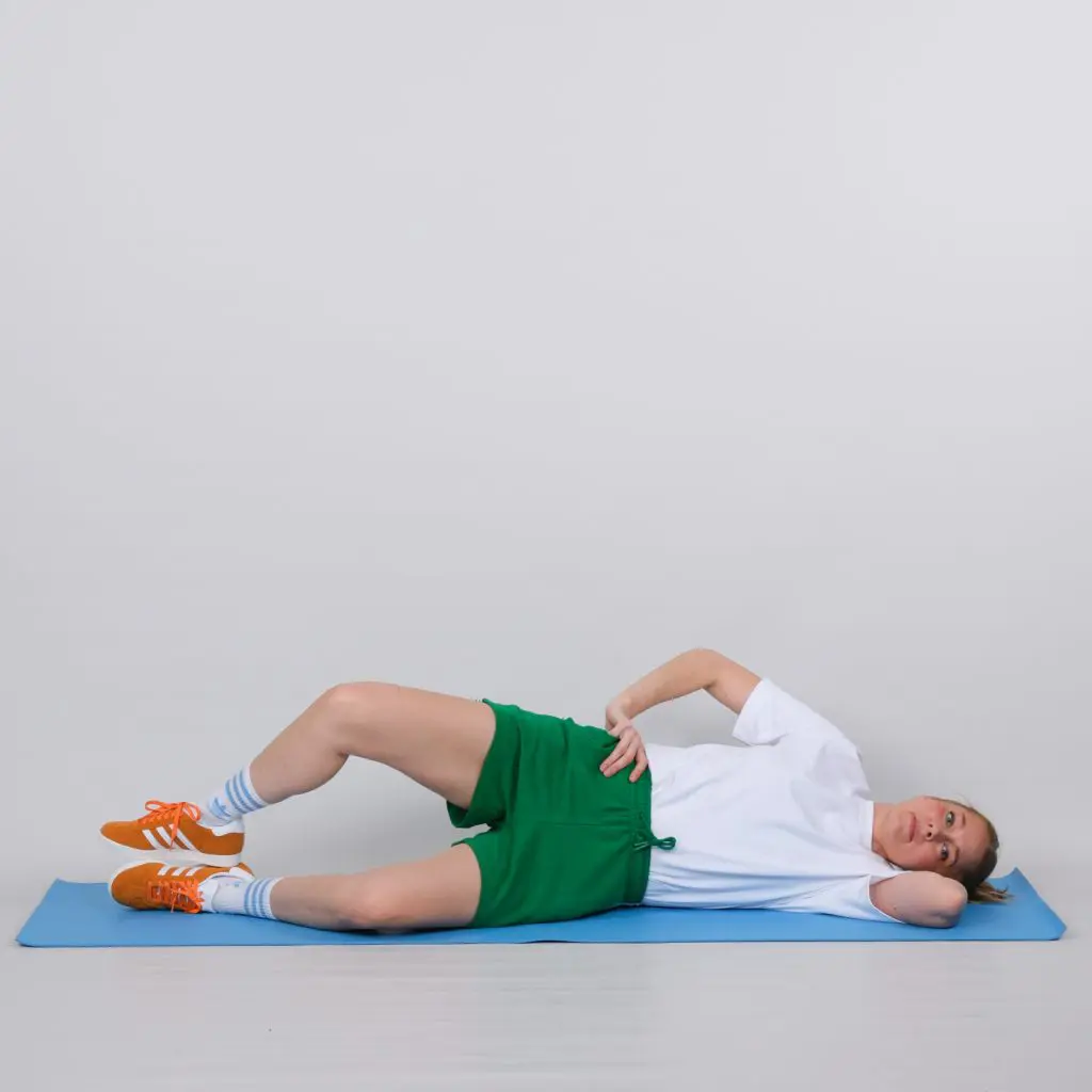 Lig på siden med det nederste ben bøjet i hofte og knæ og træningsbenet øverst. Lig let roteret forover så navlen peger mod underlaget. Spænd i ballemusklen og løft øverste ben bagud. Hold benet løftet i få sekunder og løft derefter benet op mod loftet. Hold benet i få sekunder og før det langsomt ned igen til udgangspositionen.