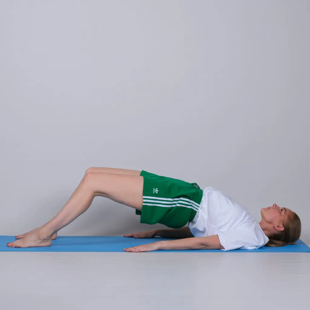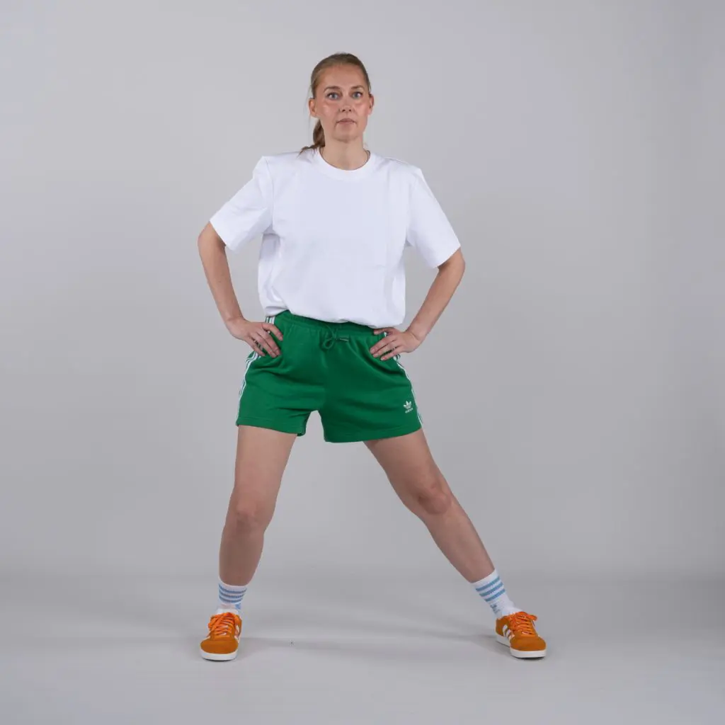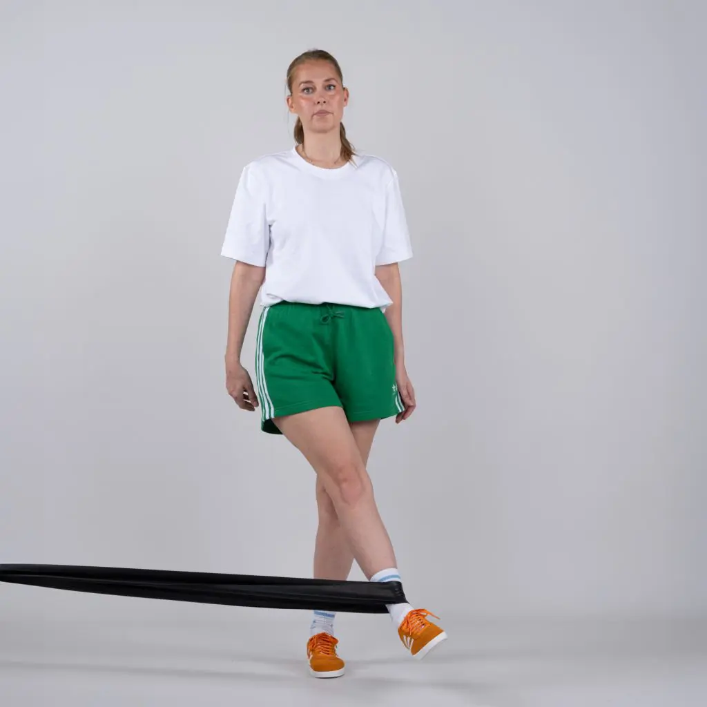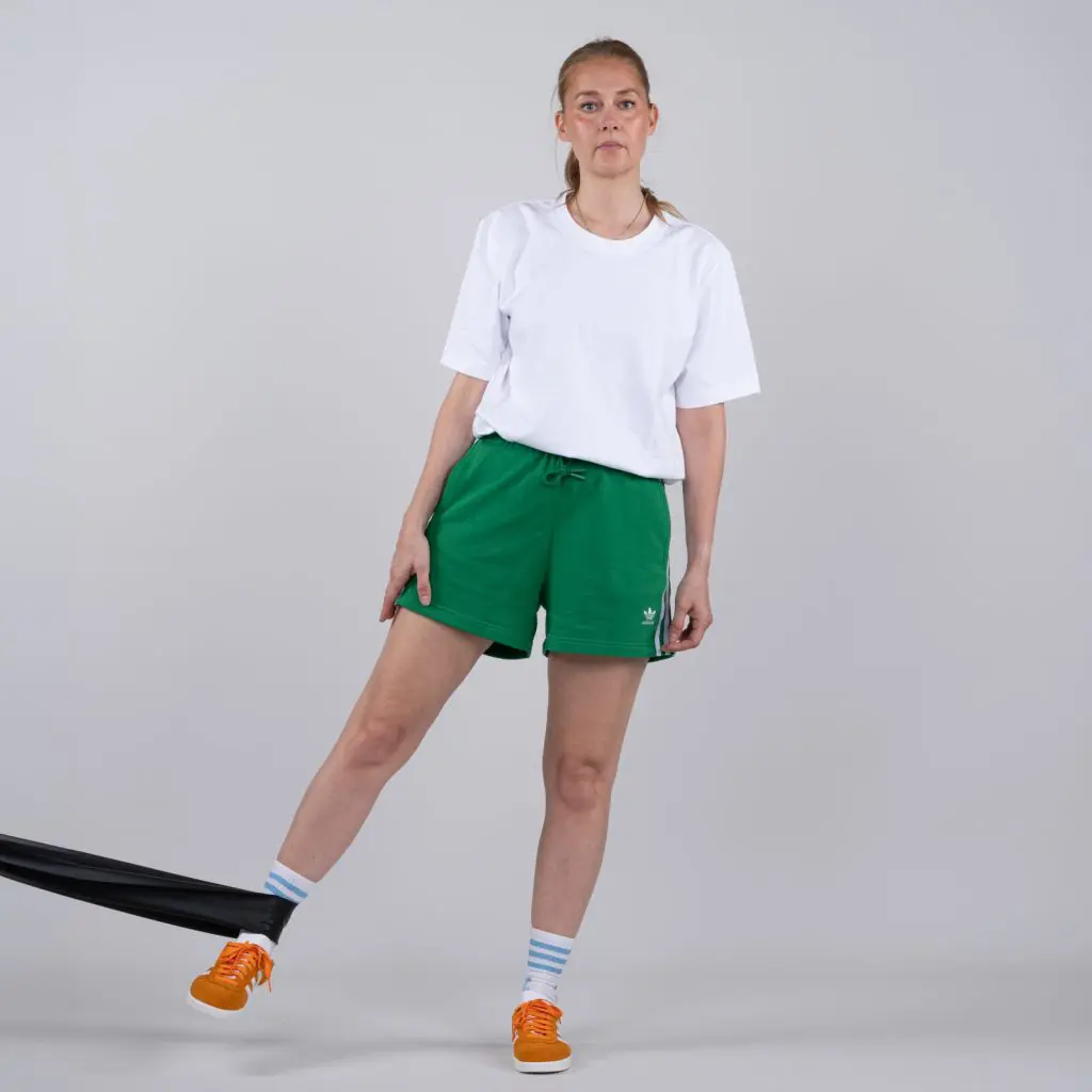 Fastgør en træningselastik 10 cm over gulvhøjde. Stå med siden mod træningselastikken med træningsbenet tættest på elastikken. Før elastikken om træningsbenet. Placer elastikken mellem knæ og ankel (jo længere nede jo kraftigere er belastningen). Før langsomt benet til siden (ind foran støttebenet), så elastikken strammes. Hold spændingen i få sekunder og før langsomt benet frem til udgangspositionen.