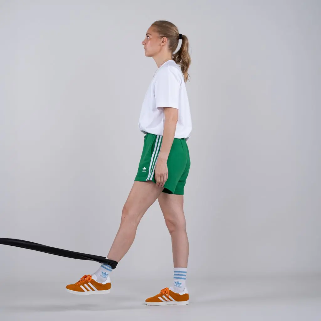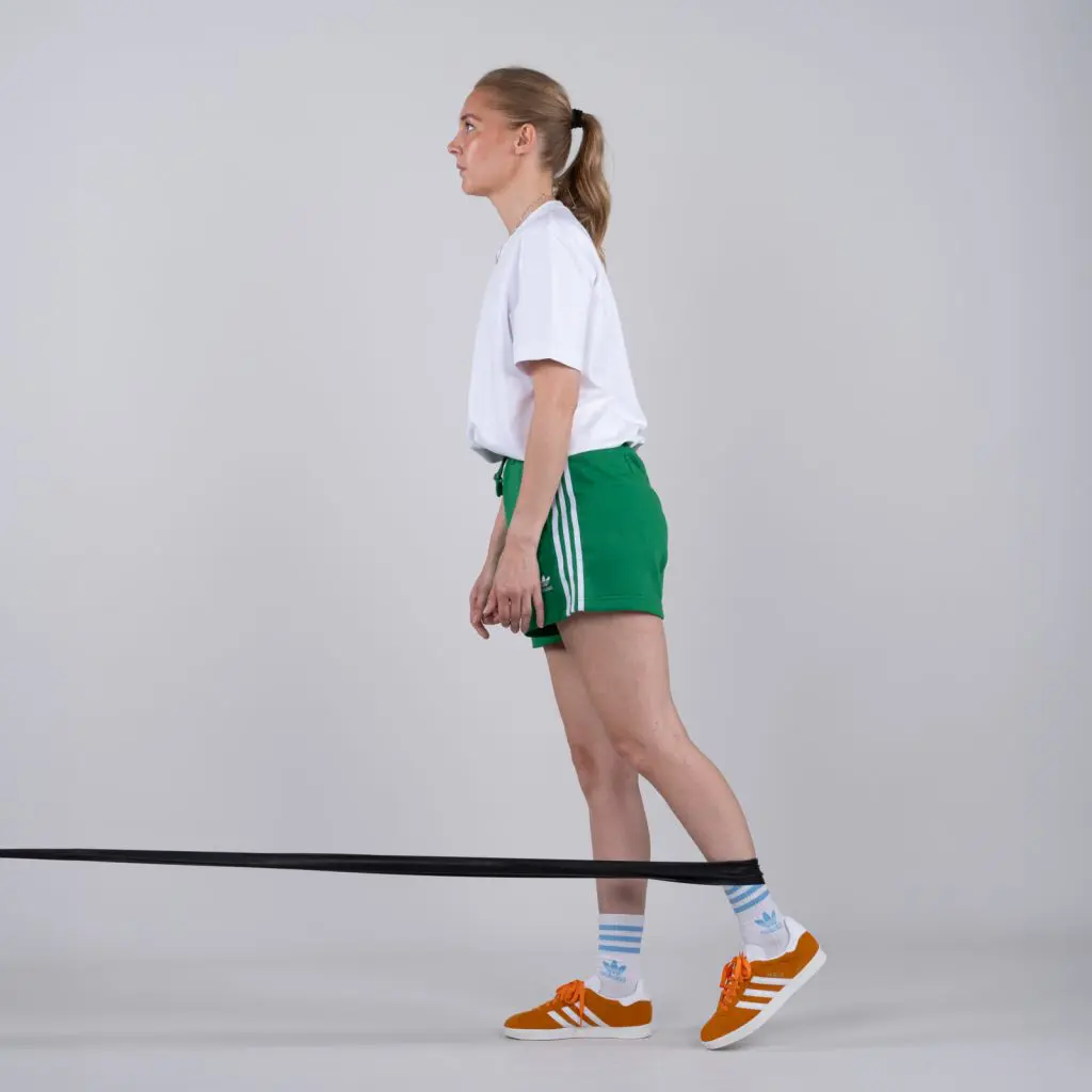Fastgør en træningselastik 10 cm over gulvhøjde. Stå med ansigtet mod træningselastikken. Før elastikken om træningsbenet mellem knæ og ankel (jo længere nede jo kraftigere er belastningen). Før langsomt benet tilbage, så elastikken strammes. Hold spændingen i få sekunder og før langsomt benet frem til udgangspositionen.