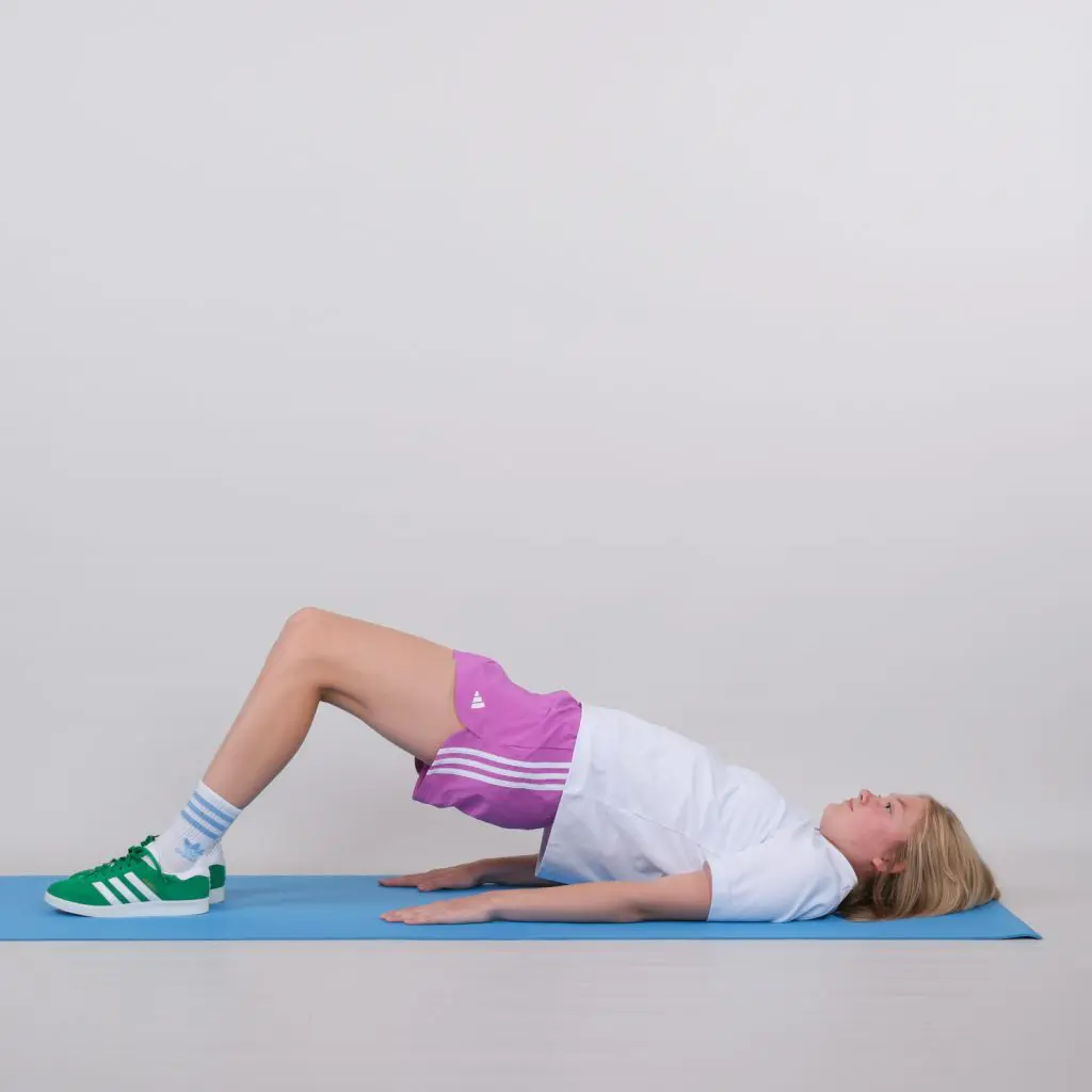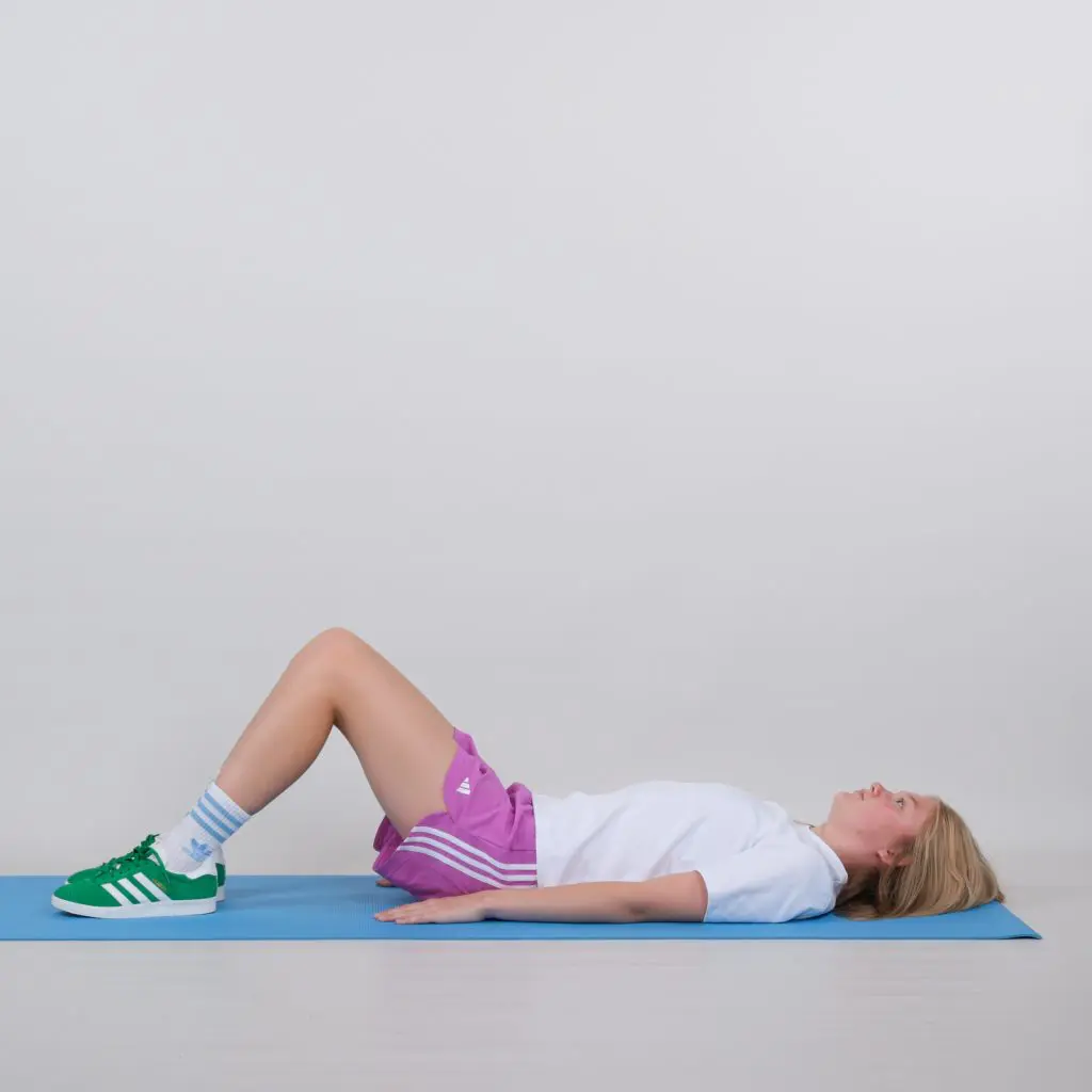 Øvelsen kan også udføres liggende på siden eller på maven. Lig på maven og læg et håndklæde om anklen. Træk med hænderne i håndklædet, så foden trækkes op og bagud. Hold udspændingen i 20 sekunder. Gentag øvelsen på skiftevis på højre og venstre ben.