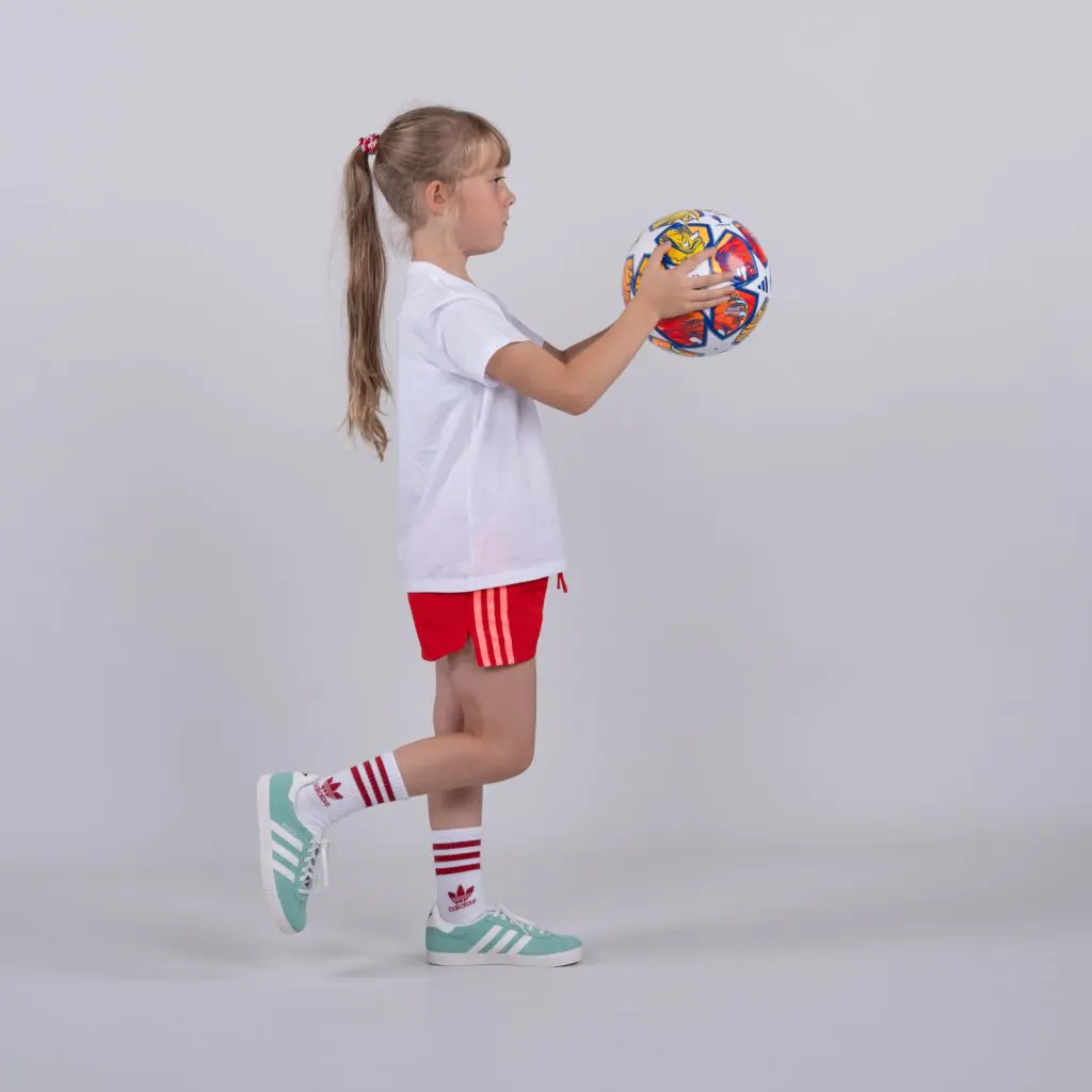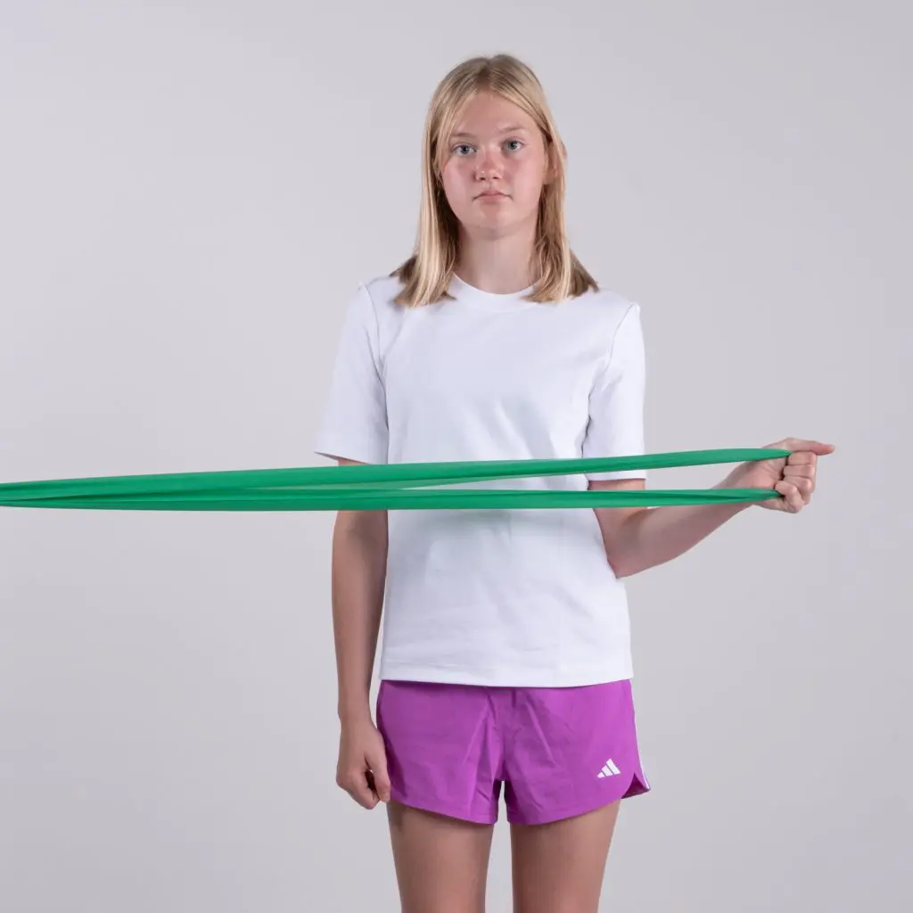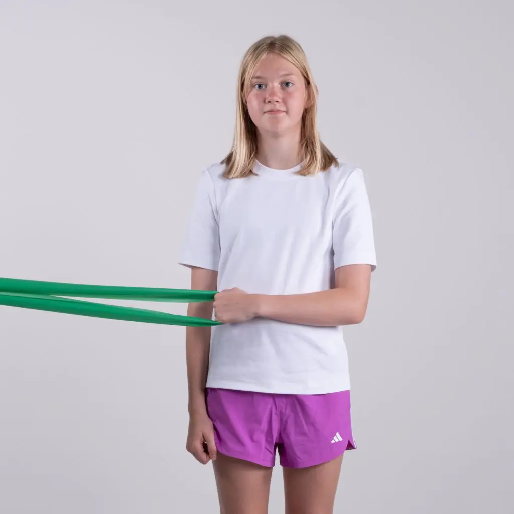 Fastgør en træningselastik i højde med albuen. Stil dig med træningsarmen længst væk fra elastikken og grib om elastikken med hånden på træningsarmen. Albuen er bøjet 90 grader og holdes ind mod kroppen under hele øvelsen. Underarmen og hånden hviler mod maven. Roter underarmen ud til siden, så elastikken spændes, og hold spændingen i få sekunder, før armen langsomt føres tilbage til udgangspositionen.