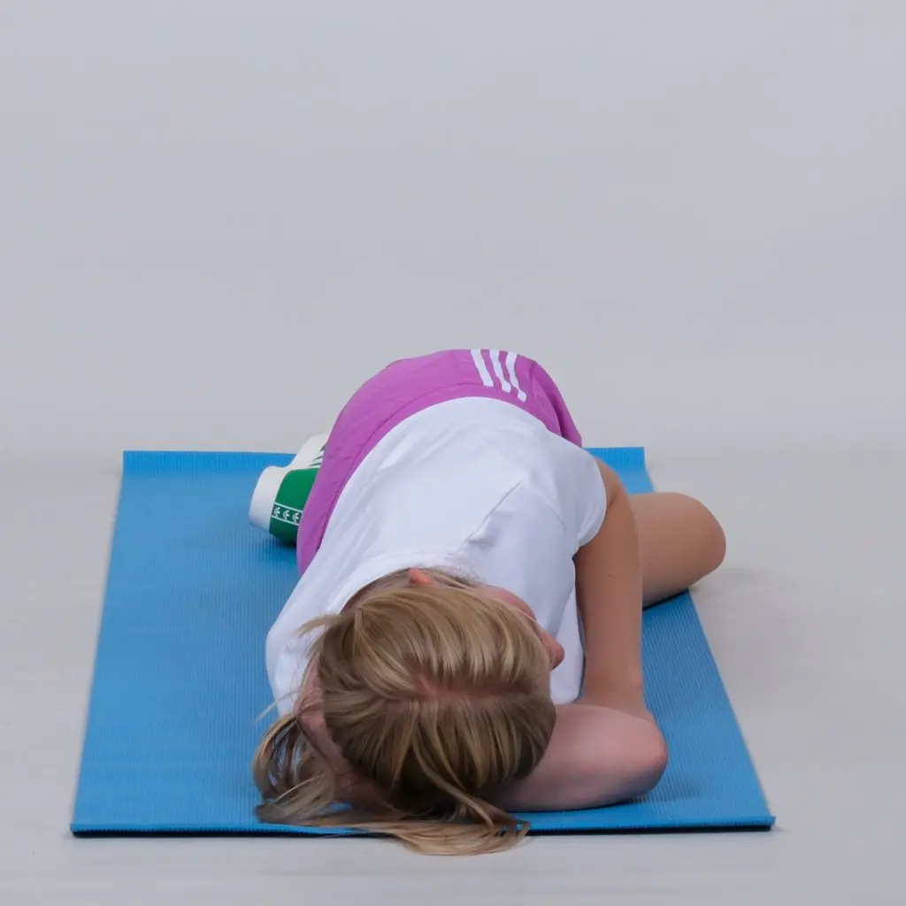 Øvelsen kan også udføres liggende på siden eller på maven. Lig på maven og læg et håndklæde om anklen. Træk med hænderne i håndklædet, så foden trækkes op og bagud. Hold udspændingen i 20 sekunder. Gentag øvelsen på skiftevis på højre og venstre ben.