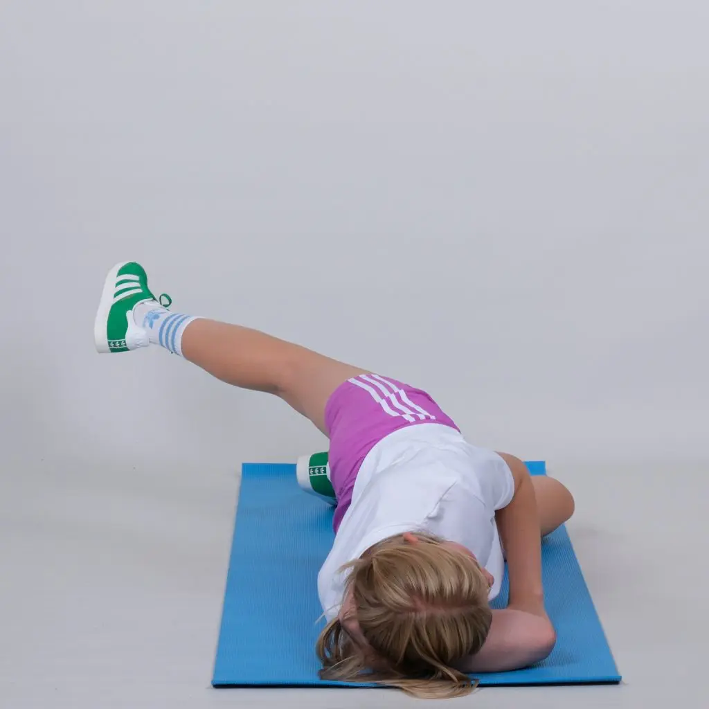 Lig på siden med det nederste ben bøjet i hofte og knæ og træningsbenet øverst. Lig let roteret forover så navlen peger mod underlaget. Spænd i ballemusklen og løft øverste ben bagud. Hold benet løftet i få sekunder og løft derefter benet op mod loftet. Hold benet i få sekunder og før det langsomt ned igen til udgangspositionen.