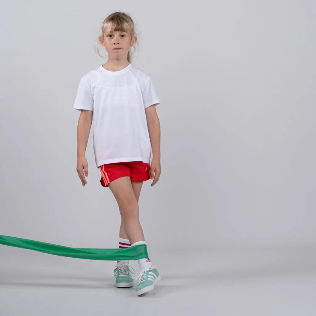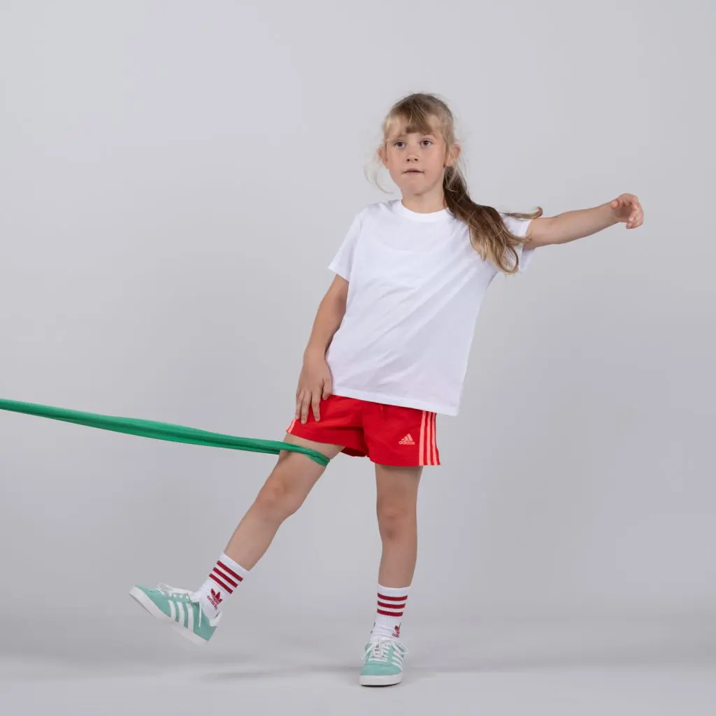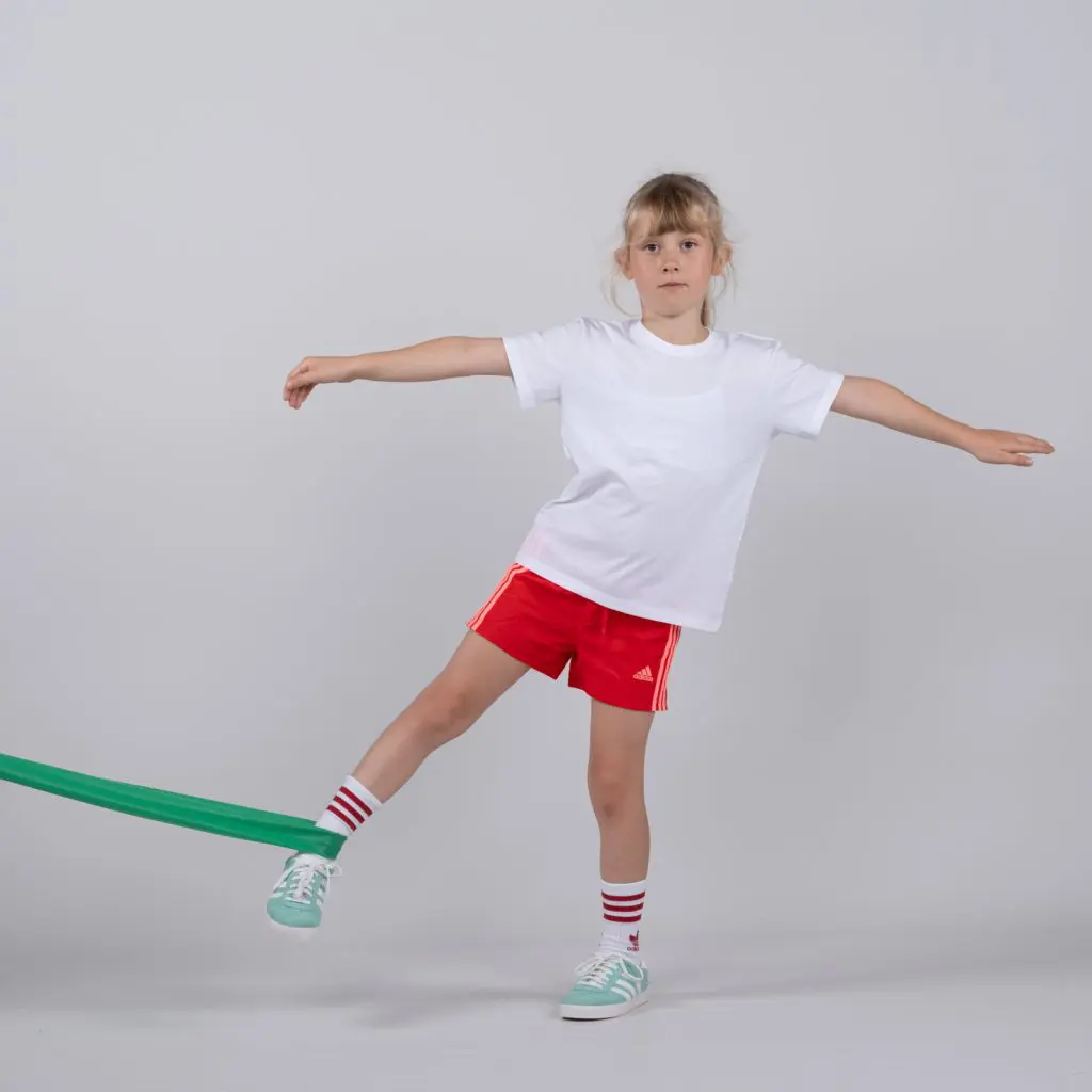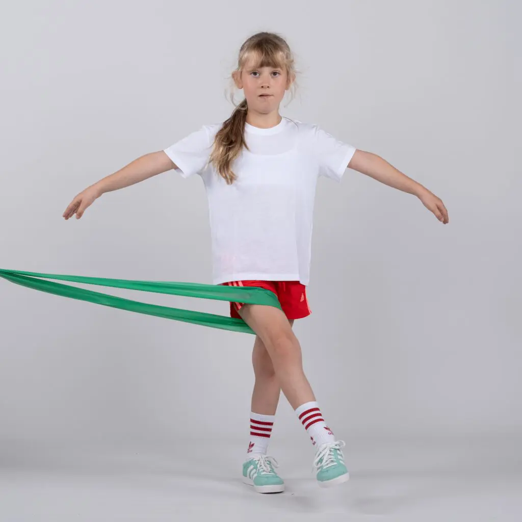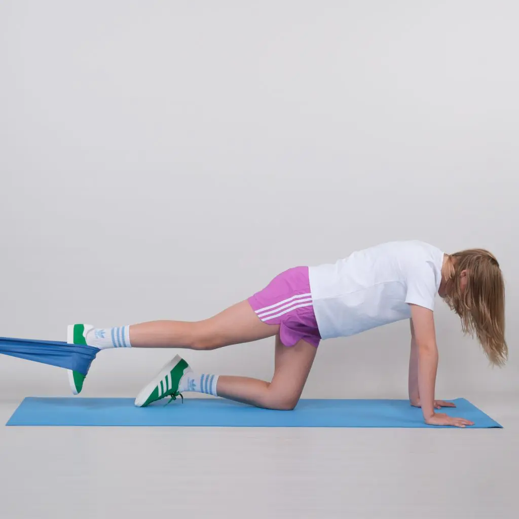 Fastgør tn træningselastik i hoftehøjde. Stå med siden mod træningselastikken med træningsbenet længst væk fra elastikken. Før elastikken om låret på træningsbenet lige over knæet. Før langsomt benet ud til siden, så elastikken strammes. Hold spændingen i få sekunder og før langsomt benet frem til udgangspositionen.