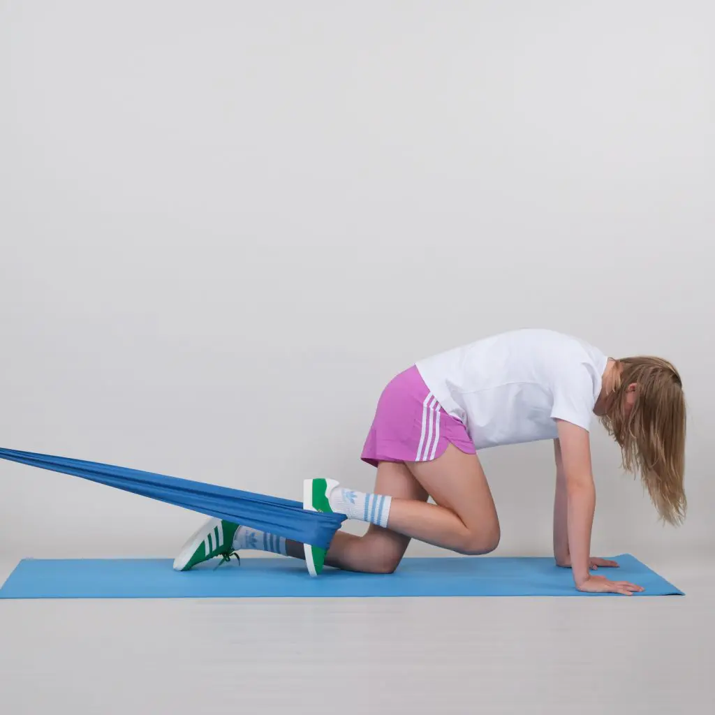 Øvelsen kan også udføres liggende på siden eller på maven. Lig på maven og læg et håndklæde om anklen. Træk med hænderne i håndklædet, så foden trækkes op og bagud. Hold udspændingen i 20 sekunder. Gentag øvelsen på skiftevis på højre og venstre ben.