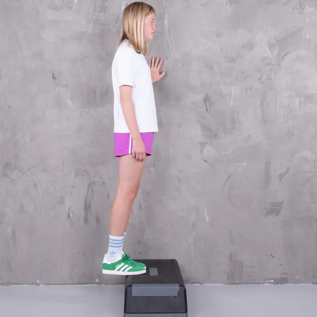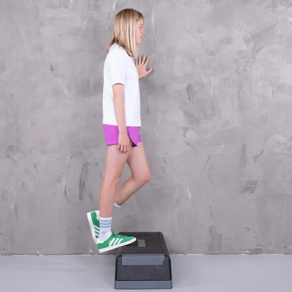 Stå på begge forfødder på et trappetrin med hælen ud over kanten. Rejs dig langsomt op på tæer med vægten på det raske ben. Sænk dig langsomt ned på træningsbenet, så langt du kan komme, så det strammer i lægmusklen. Brug det raske ben til at komme op på tæer igen. Støt evt. med en hånd på væggen. Øvelsen udføres skiftevis med strakt og bøjet knæ. Belastningen kan øges ved at tage en rygsæk på og efterhånden øge ballastningen i rygsækken.